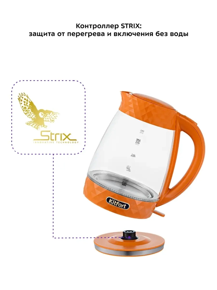Электрический чайник Китфорт КТ-6123 — незаменимая вещь на каждой кухне, он в разы сокращает время нагрева воды по сравнению с обычной плитой. При этом не нужно следить, когда вода закипит: чайник выключится автоматически. Если во время работы чайник снять с подставки, он автоматически отключится, а кнопка включения/выключения вернется в исходное положение.