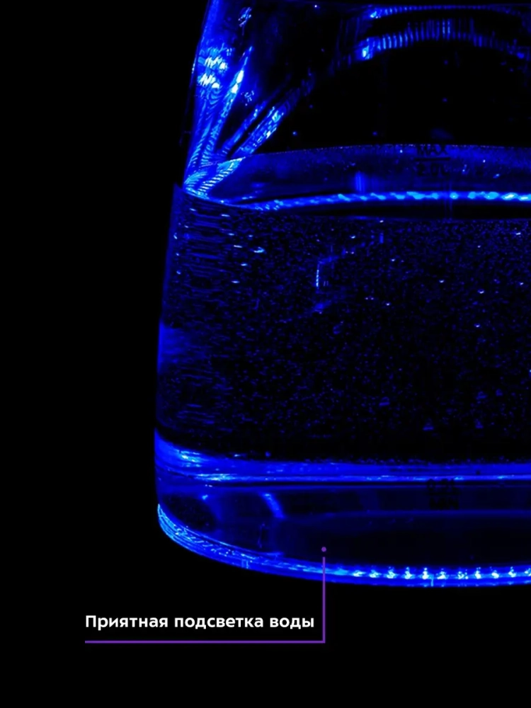 Кнопка открывания крышки расположена на ручке. При ее нажатии крышка легко поднимается вверх. Для закрытия крышки просто надавите на нее и опустите вниз до щелчка. Кнопка включения/выключения находится под ручкой. При включении чайника загорается синяя подсветка, которая является индикатором работы.