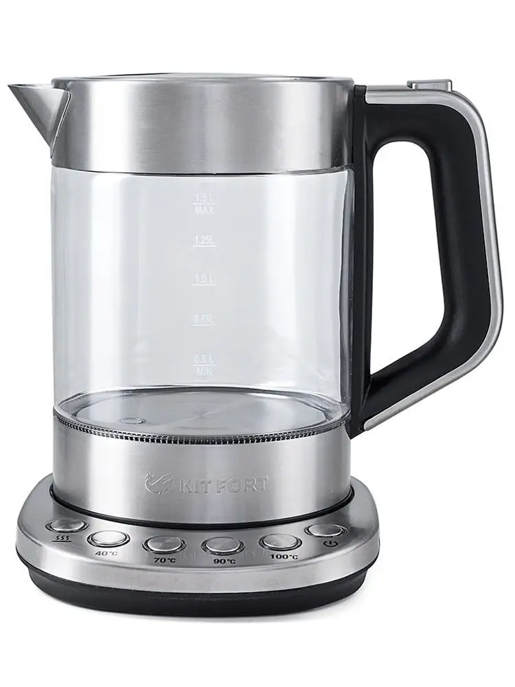 Электрический чайник с терморегулятором Kitfort КТ-616 может не только вскипятить воду, но и нагреть ее до температуры 40, 70 и 90 °С, что очень удобно при заваривании различных сортов чая. Температура 40 *С пригодится для приготовления детского питания. Чайник также оснащен функцией поддержания температуры. Температура воды контролируется встроенным в дно чайника термодатчиком.