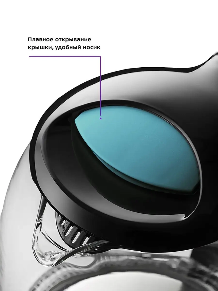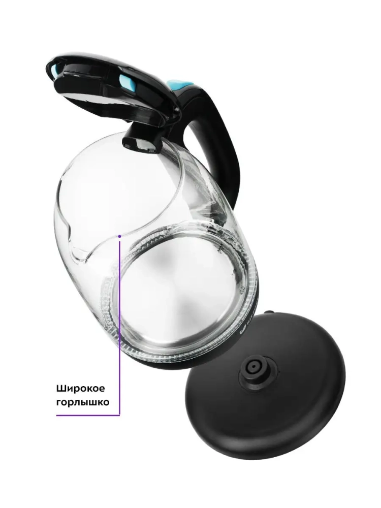 Корпус чайника выполнен из стекла, а крышка и подставка — из пластмассы. Мерная шкала нанесена на прозрачную часть корпуса. Большое горлышко чайника облегчает доступ внутрь при мытье и во время удаления накипи. Ручка чайника пластиковая, не нагревается и удобно лежит в руке.