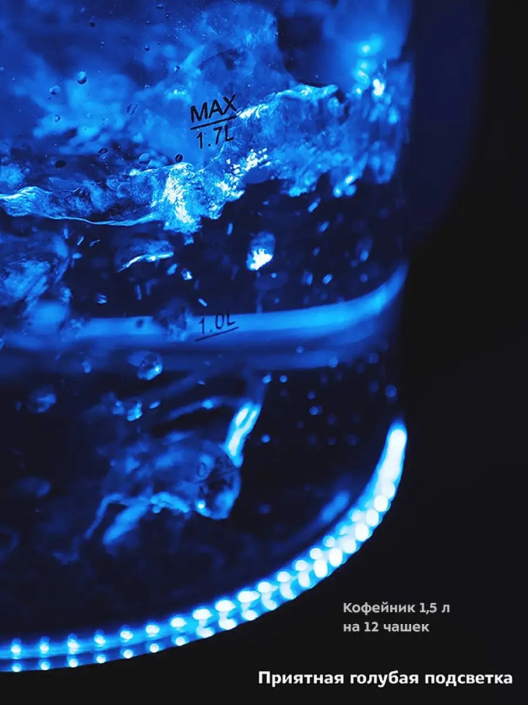 Кнопка открывания крышки расположена сверху на крышке, а кнопка включения — на ручке. При включении чайника загорается синяя подсветка, которая является индикатором работы и одновременно художественно подсвечивает кипящую воду.