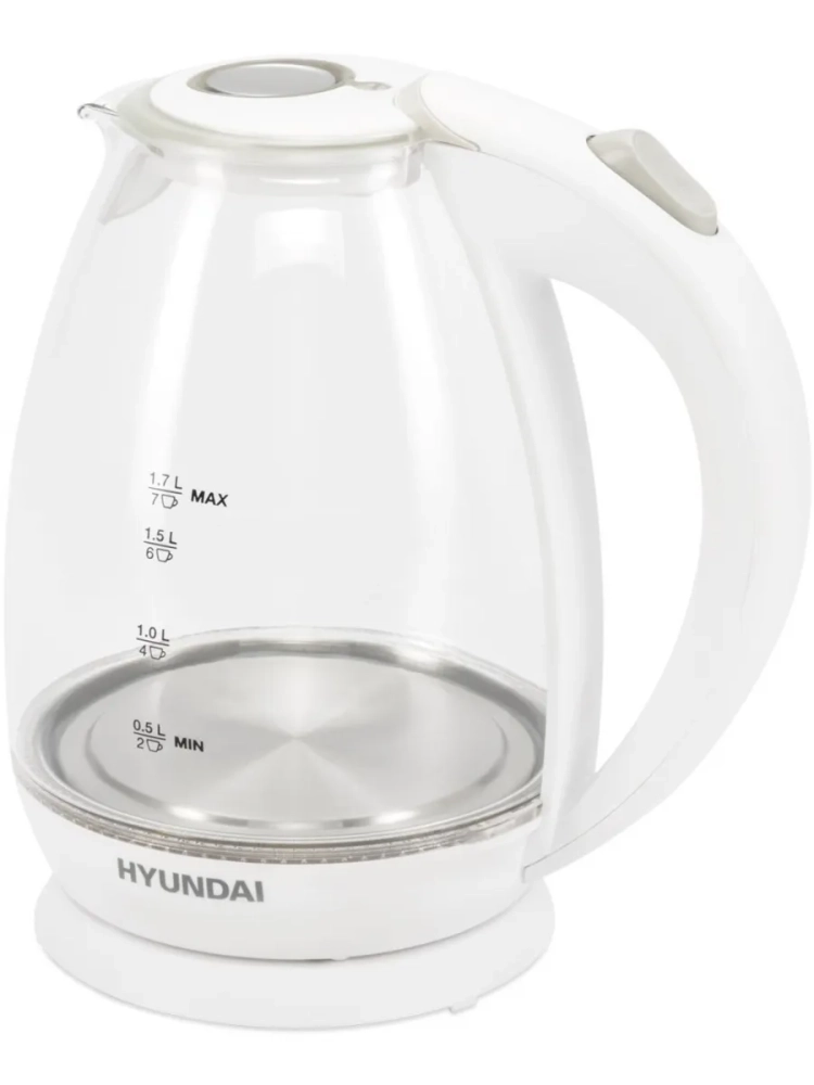 Чайник электрический Hyundai HYK-G2409 белый/серебристый, объём 1.7л, мощность 2200Вт, материал корпуса: стекло/пластик.
