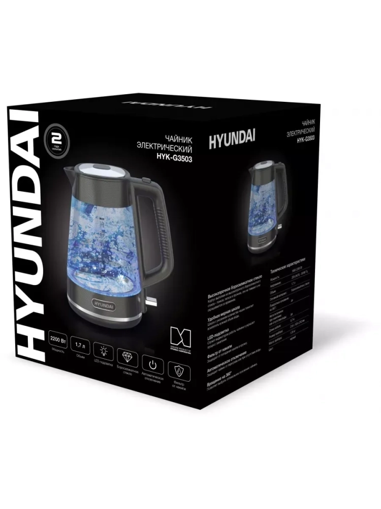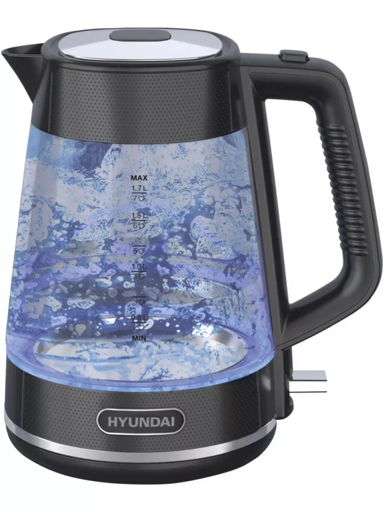 Легкий и мощный электрический чайник с подсветкой Hyundai HYK-G3503 быстро вскипятит или подогреет воду для чая, кофе и любого другого горячего напитка. Нанесенная на стеклянную часть корпуса шкала позволит рассчитать количество порций, а носик с защитным фильтром – обеспечит удобное наполнение чашек.
