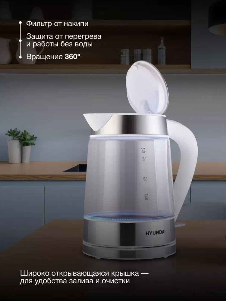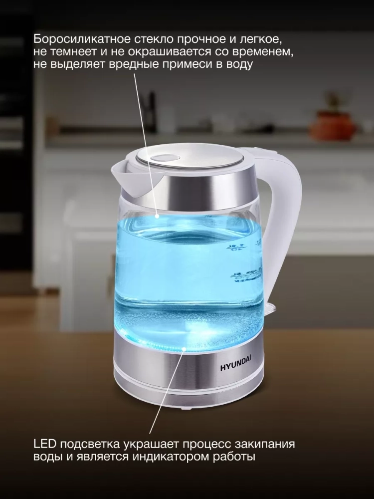 • Благодаря использованию боросиликатного стекла, чайник не только выглядит стильно, но и гарантирует безопасность использования. LED подсветка придает ему особый шарм.