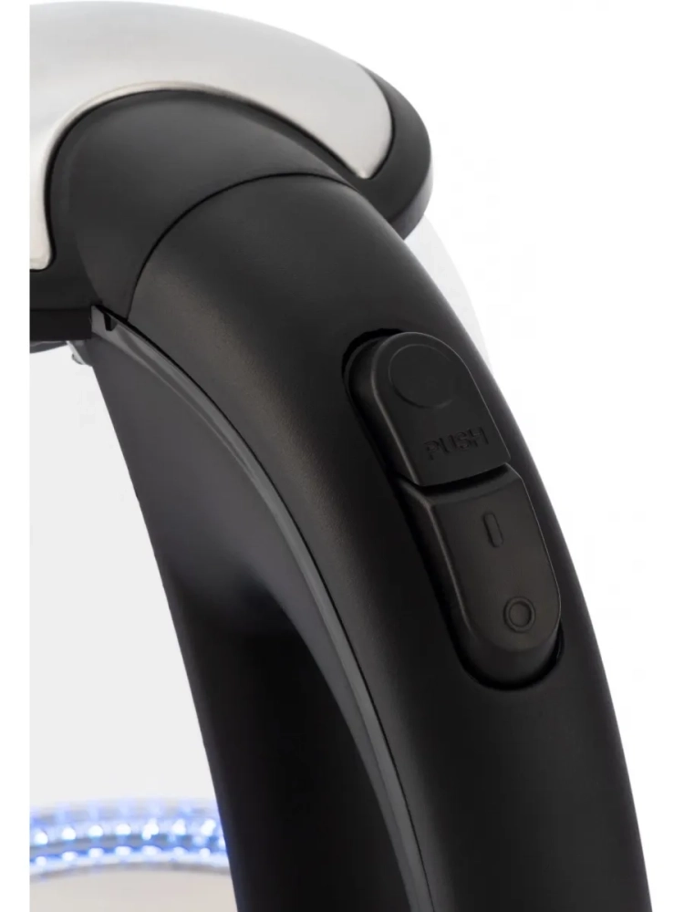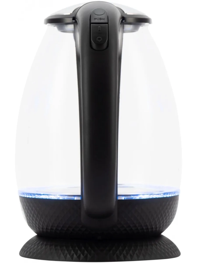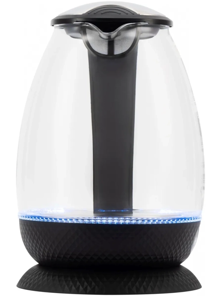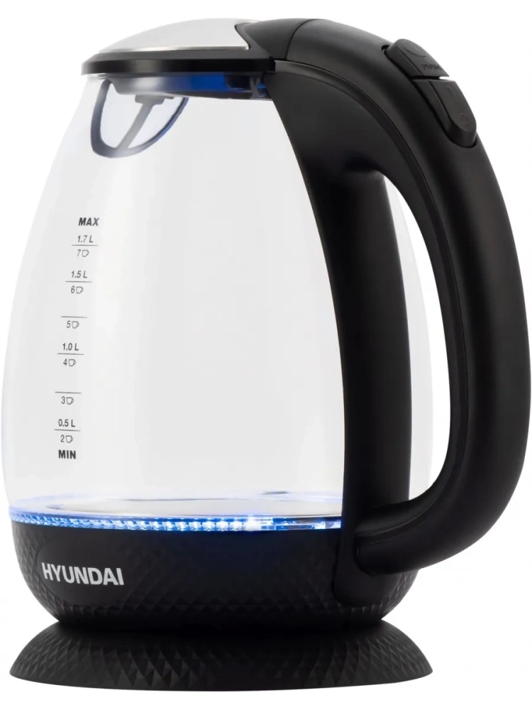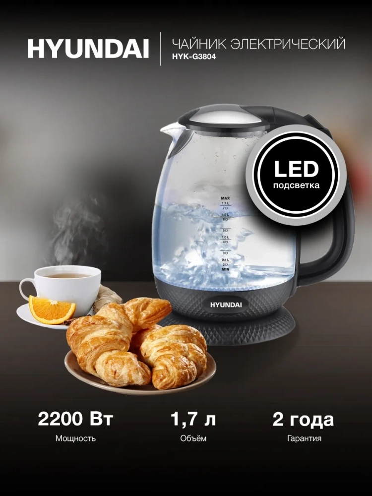 Hyundai HYK-G3804 оснащён прозрачными стенками и яркой внутренней подсветкой. С помощью имеющихся 2200 Вт мощности электрический чайник нагревает воду до состояния кипятка за пару минут. Максимально он вмещает до 1.7 л – этого объёма хватает на чаепитие большой семьи. Корпус девайса изготовлен из боросиликатного стекла. Выбор пал на этот материал неслучайно, ведь именно данная разновидность стекла наилучшим образом удерживает температуру и долгое время не даст жидкости остыть. На бока удобно нанесена градация, с помощью которой можно судить о том, насколько наполнен прибор.
