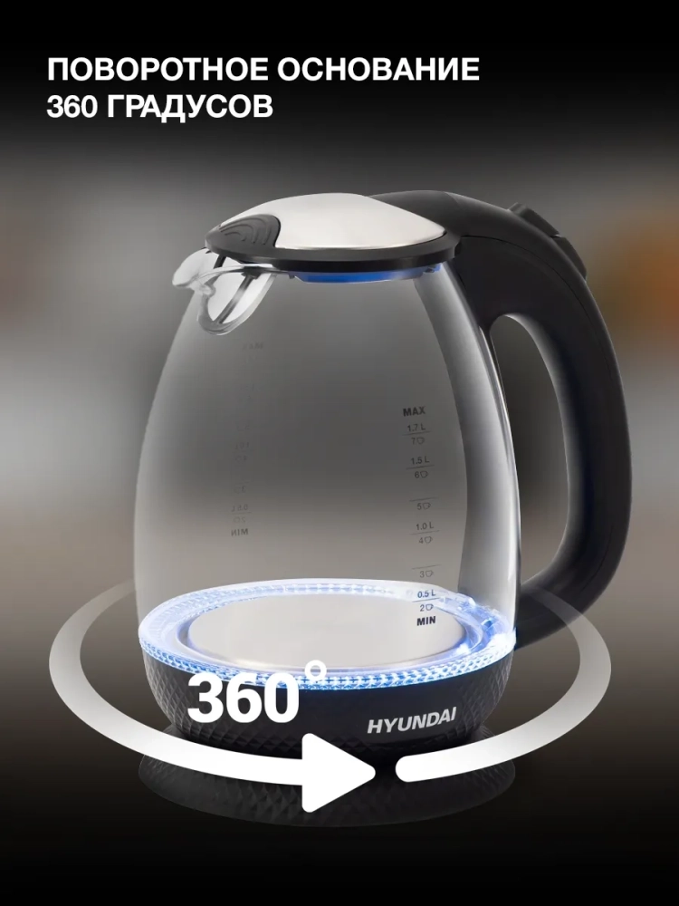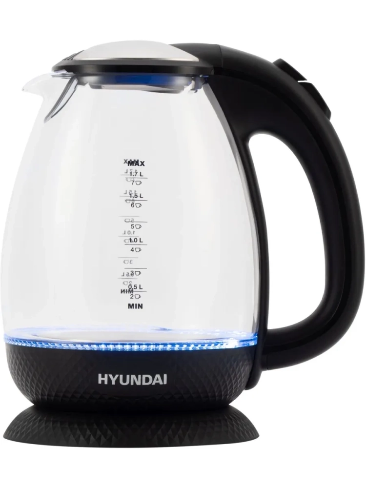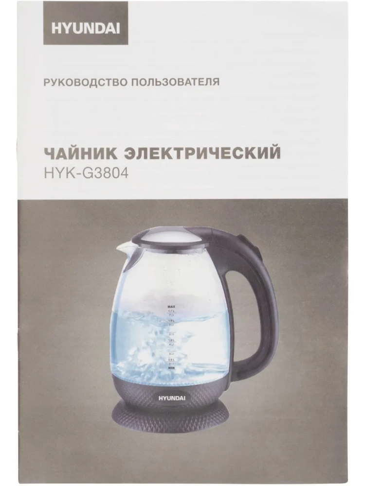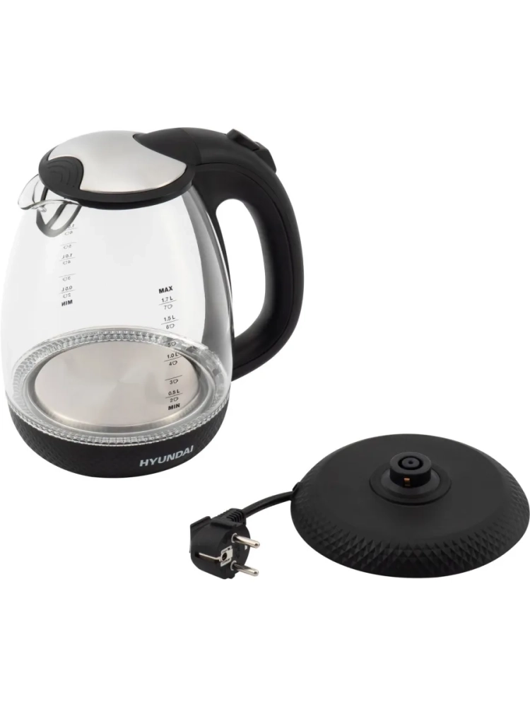 Когда Hyundai HYK-G3804 включается, срабатывает специальная индикация, по которой легко определить, закончился ли цикл. Ей служит подсветка, установленная в дно устройства. Пустым прибор активировать не получится – для этого в нём присутствует специальная система защиты. Нагревательный элемент данной модели спрятан в корпус, а её подставка позволяет чайнику проворачиваться на 360 градусов.