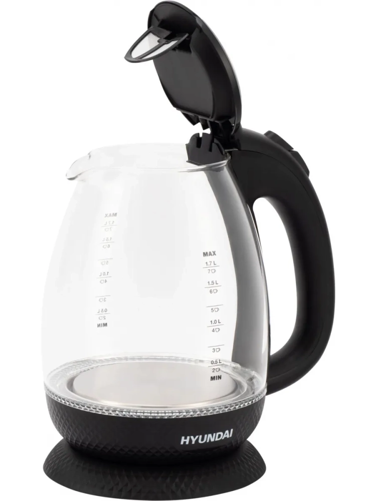 Крышка Hyundai HYK-G3804 открывается по щелчку кнопки. В носик электрического чайника встроен мелкодисперсный фильтр, не дающий накипи проникать в чашку во время налива.