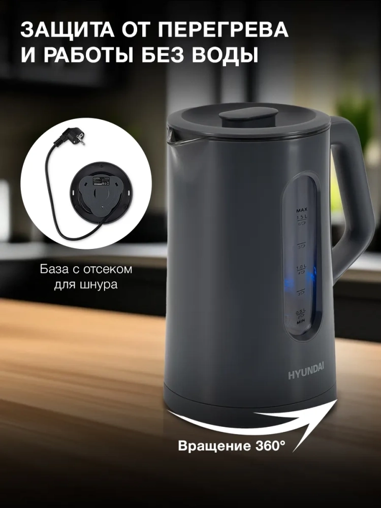 Hyundai HYK-G4508 оснащен автоматическим отключением и защитой от включения без воды, что гарантирует безопасное использование. Подставка с вращением на 360 градусов делает использование чайника еще удобнее.