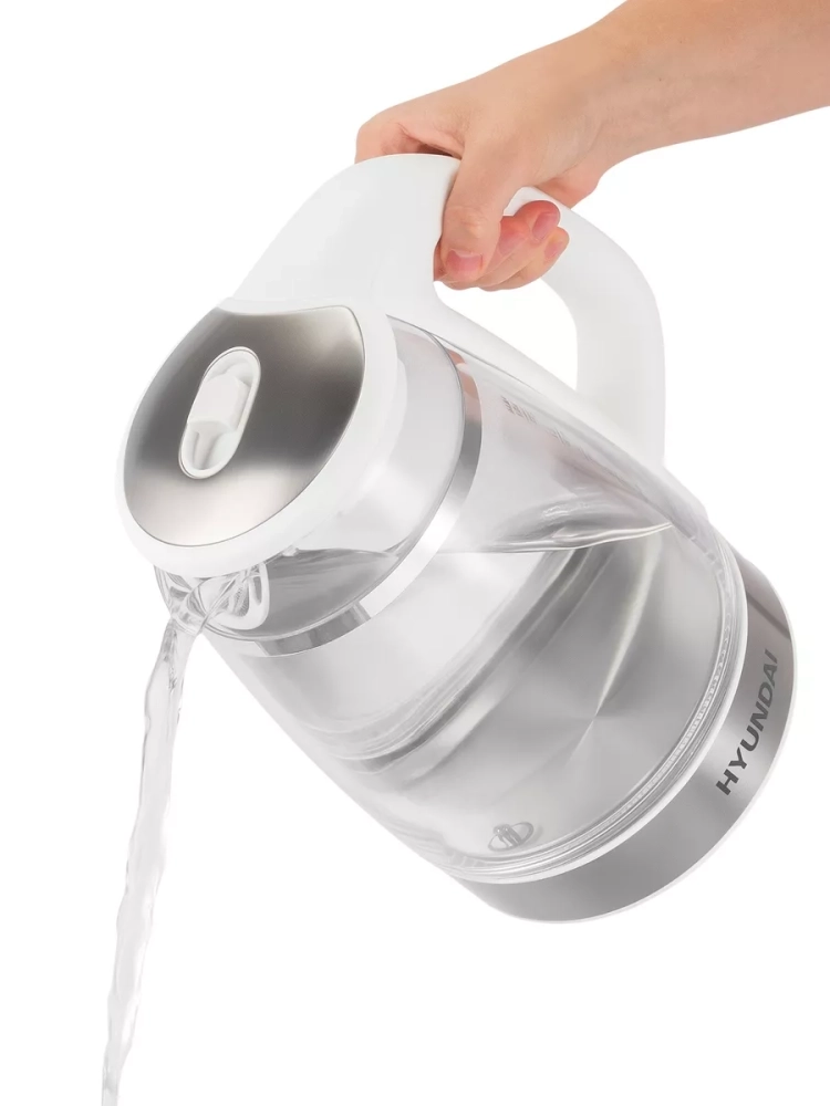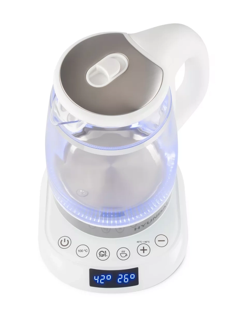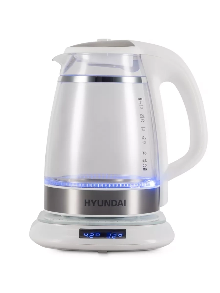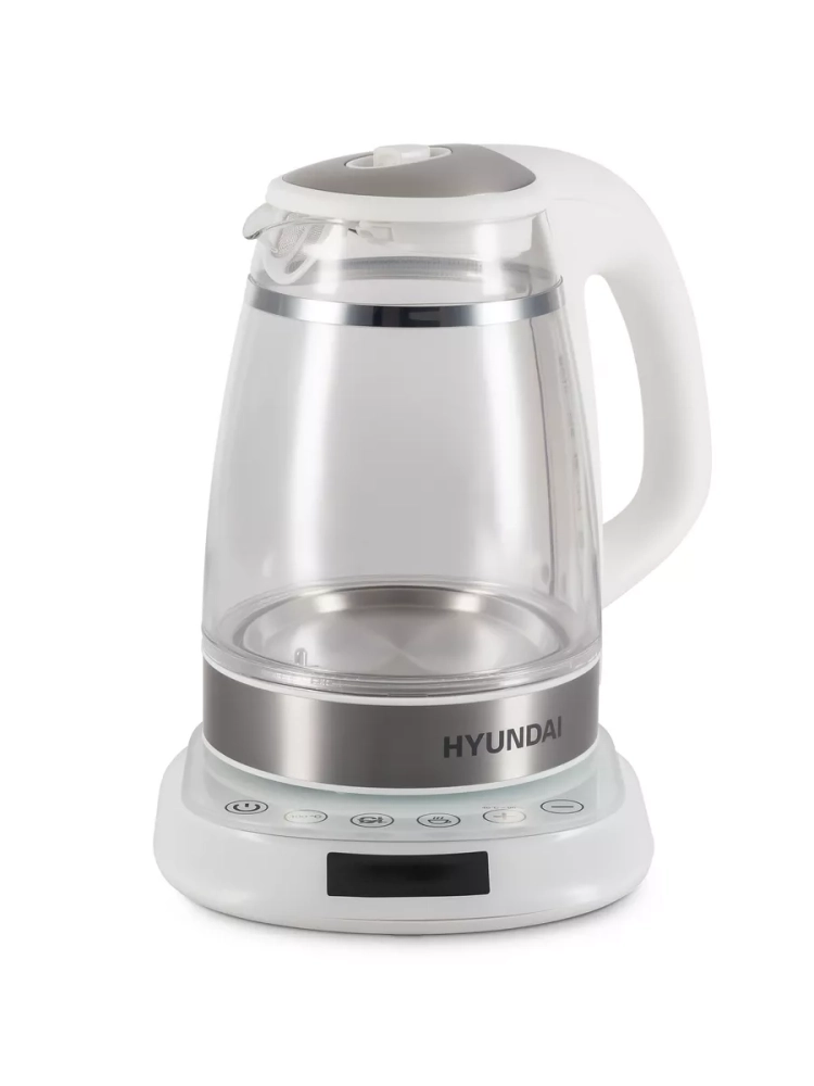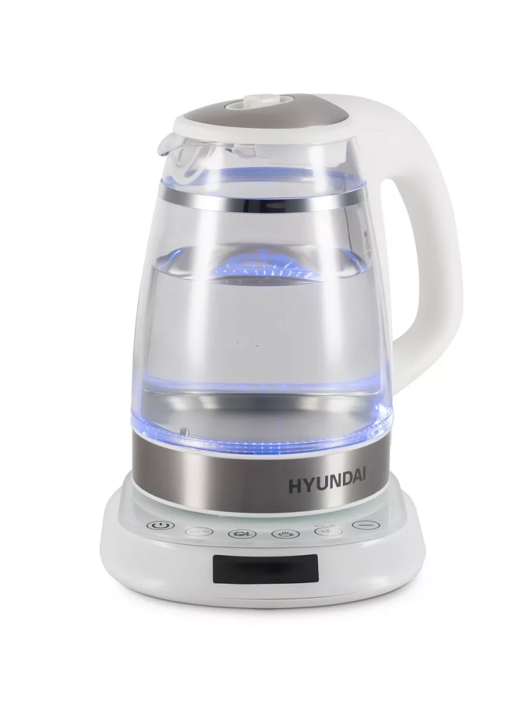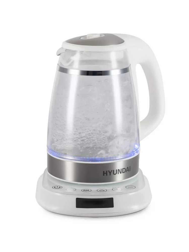 Чайник электрический Hyundai HYK-G5507 белый/серебристый, объём 1.7л, мощность 2200Вт, материал корпуса: стекло. Двойной теплоизолированный корпус. Внешний корпус из прозрачного пластика, защищает от случайного ожога при прикосновении. Внутренний корпус из боросиликатного стекла, не впитывает и не выделяет примесей, не темнеет и не окрашивается со временем. Электрический чайник с двойными стенками на базе, для быстрого приготовления теплой и горячей воды нужной температуры под разные цели. Это не просто чайник, а современный, безопасный и качественный инструмент на вашей кухне под разные задачи. Информационный дисплей, сенсорное управление установками температуры 40-100С и функцией поддержания, для любых напитков и бытовых нужд.