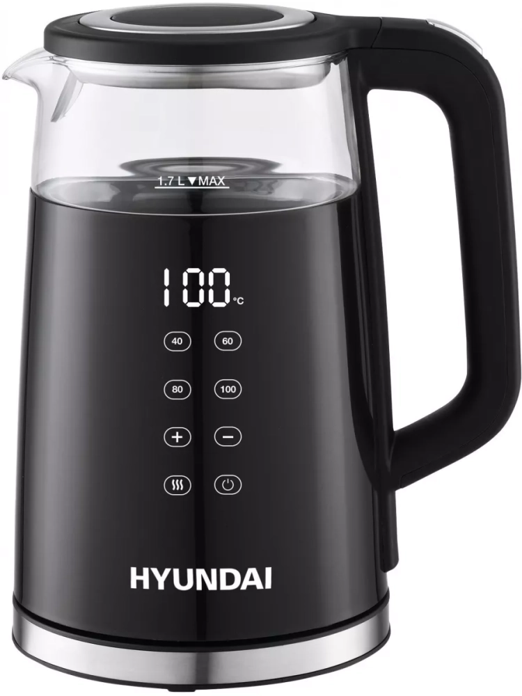 Чайник электрический Hyundai HYK-G6404 черный/серебристый, объём 1.7л, мощность 2200Вт, материал корпуса: стекло/пластик. Чайник имеет 13 настраиваемых температурных режима для разных сортов чая, кофе, настоек и компотов, приготовления детского питания и других бытовых нужд, + функция поддержания температуры. Температурные режимы: 40,45,50,55,60,65,70,75,80,85,90,95,100, + функция поддержания температуры. Электрический чайник высокой мощности для быстрого приготовления теплой и горячей воды нужной температуры под разные цели. Это не просто чайник, а современный и качественный инструмент на вашей кухне под разные задачи. Информационный LED дисплей с отображает текущую температуру в чайники и ход выполнения установок. Кнопки имеют сенсорное Touch управление в одно касание для изменения настроек, интуитивно понятно и легко.