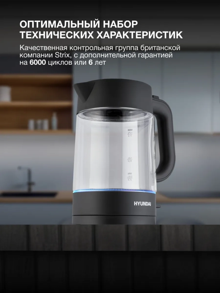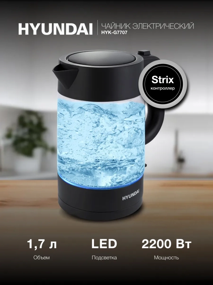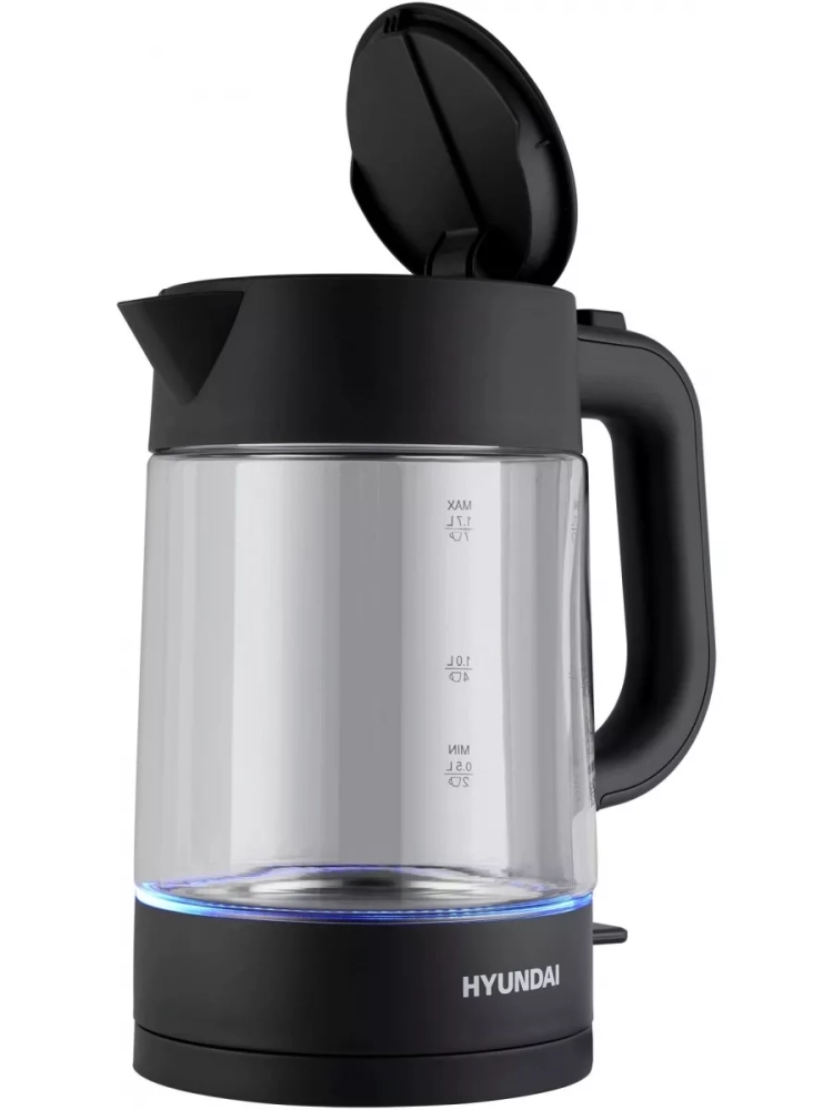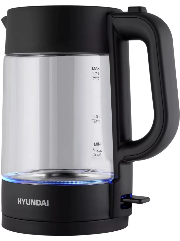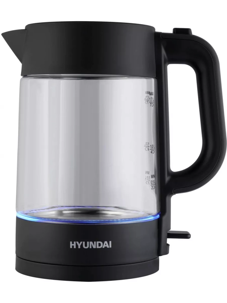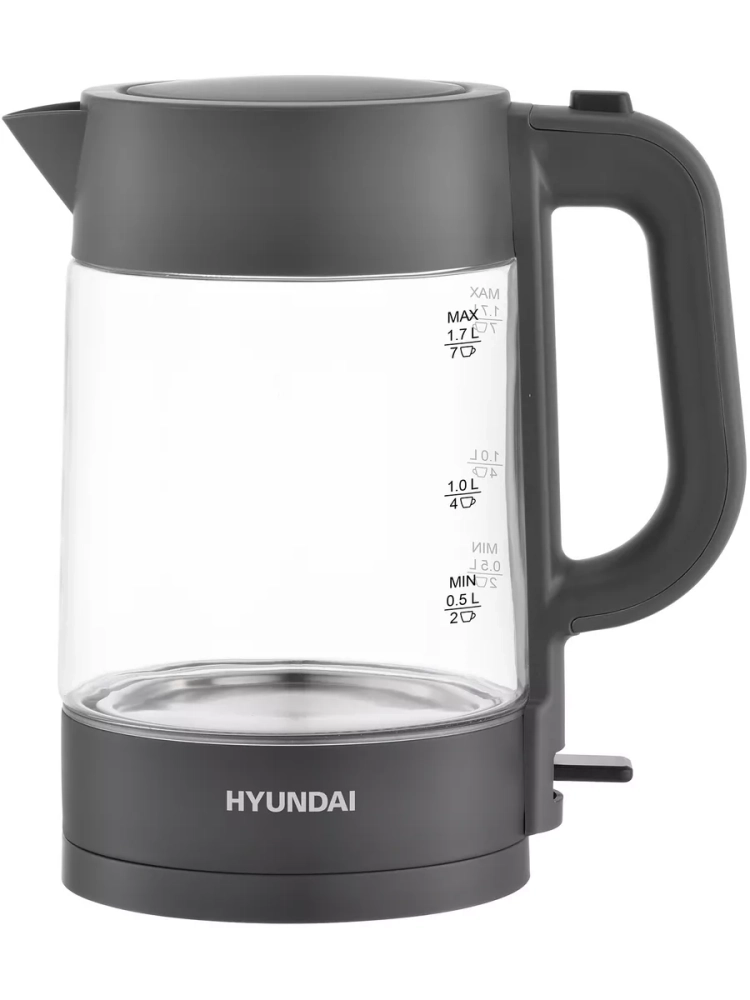 Электрический чайник Hyundai HYK-G7707 в стильном графитовом исполнении имеет мощность в 2200 Вт для быстрого закипания, а объем в 1.7 литра идеально подойдет для семейного использования.