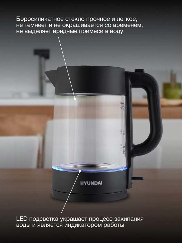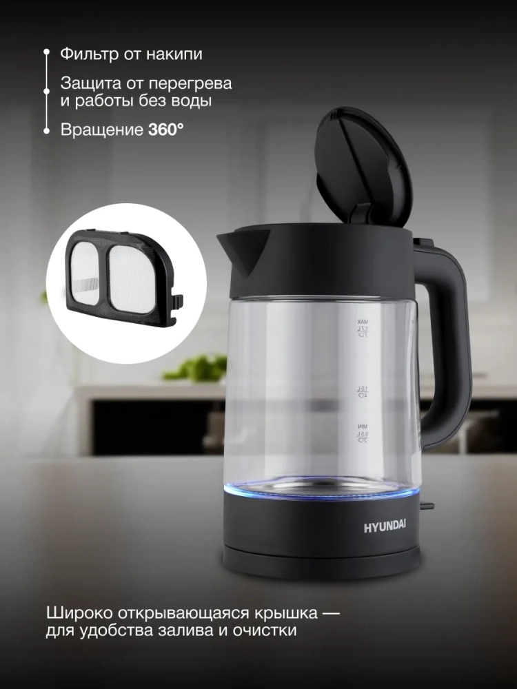 Отличается продуманным дизайном, ориентированным на удобство. Корпус изготовлен из прочного и безопасного стекла. Широко открывающаяся крышка обеспечивает удобство наполнения водой и легкую очистку, а эргономичная ручка гарантирует комфортный и надежный захват.