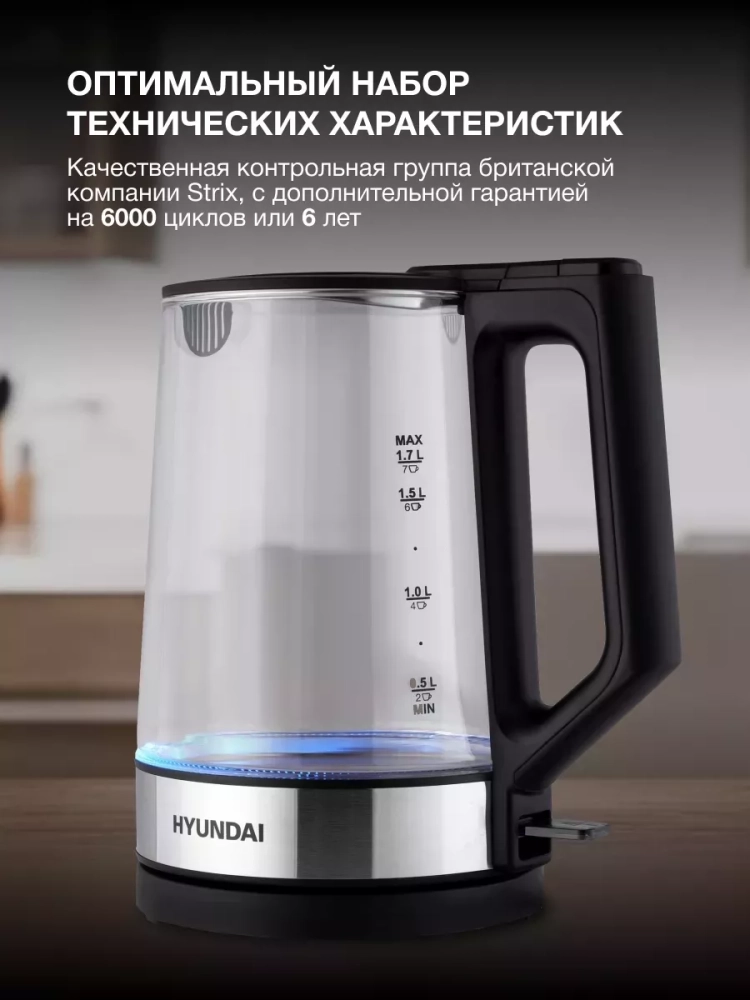 Надежная контрольная группа британской компании Strix (VnQ) отвечает за точность работы и безопасность прибора. Ее ресурс рассчитан на 6000 циклов включения, что при регулярном использовании обеспечивает стабильную работу на протяжении нескольких лет. Контроллер автоматически отключает устройство при закипании и защищает его от включения без воды, предотвращая перегрев и повышая срок службы.