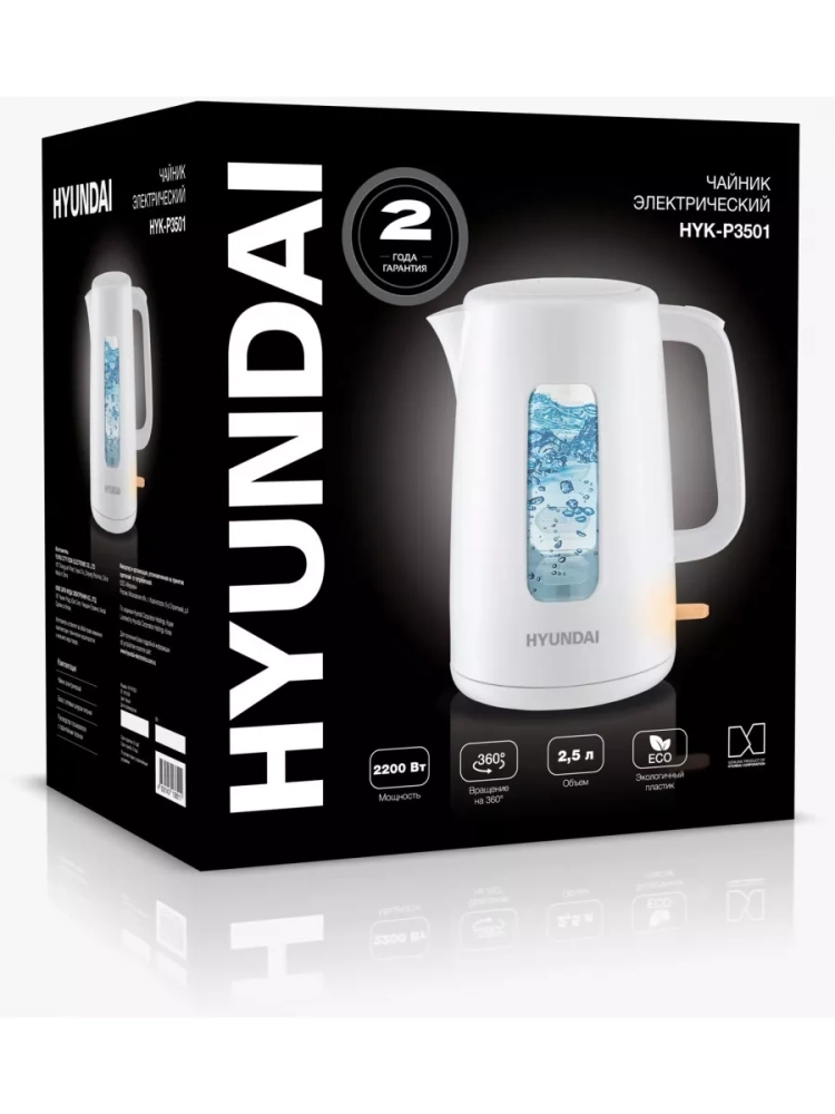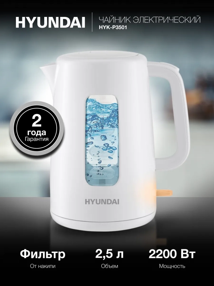 Hyundai HYK-P3501 – электрический чайник объемом 2,5 л позволит вскипятить или подогреть необходимое количество воды для приготовления сразу 10 порций горячего напитка. Скользящий кольцевой контакт позволяет ставить чайник на базу в любом положении, а система защитного отключения позволит спокойно заниматься другими домашними делами во время работы прибора.