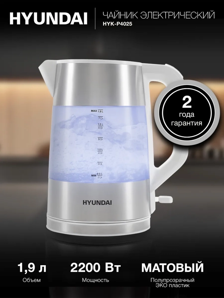Hyundai HYK-P4025 – это надежный и эргономичный электрический чайник в минималистичном исполнении.