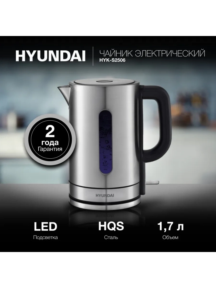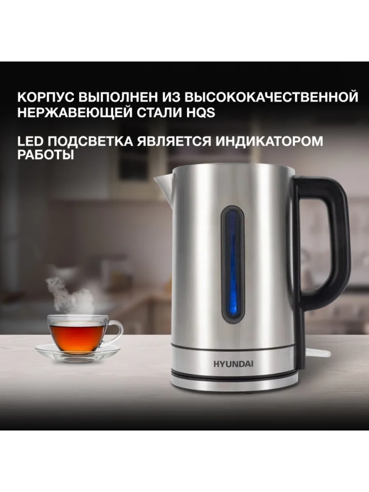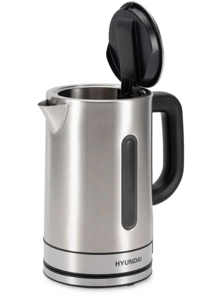 Hyundai HYK-S2506 – электрический чайник с корпусом из нержавеющей стали, обладающей высокой стойкостью к деформации. Благодаря скрытому в дне нагревательному элементу мощностью 2200 Вт он способен вскипятить до 1,7 воды за считанные минуты.