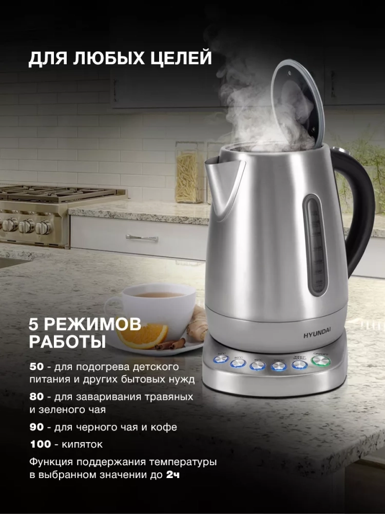 • Разнообразие температурных режимов (50°C, 80°C, 90°C, 100°C) — оптимальный нагрев для разных видов чая и кофе