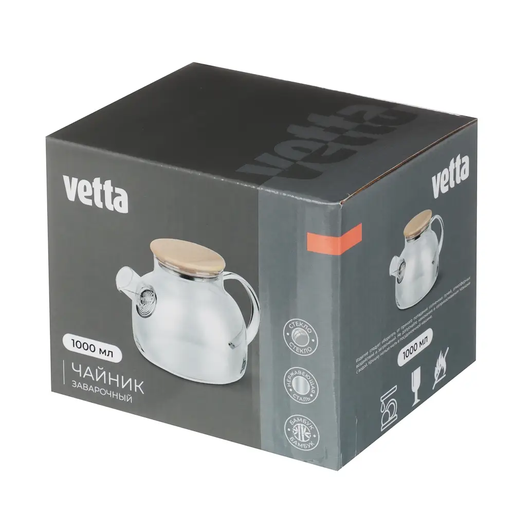 Заварочный чайник Vetta подходит для чаепитий в семье из 4-5 человек или дружеских компаниях. Объем - 1000 мл. Металлический фильтр установлен сверху. Заварка полностью контактирует с водой в чайнике, при этом не попадает в чашки. Чайник из закаленного стекла - легкий, прозрачный, подходит для любого интерьера. Можно мыть в посудомоечной машине. Чайник нельзя подогревать на плите - заливайте в него готовый кипяток. Он станет идеальным презентом на любое событие и порадует даже самых избирательных домохозяек.