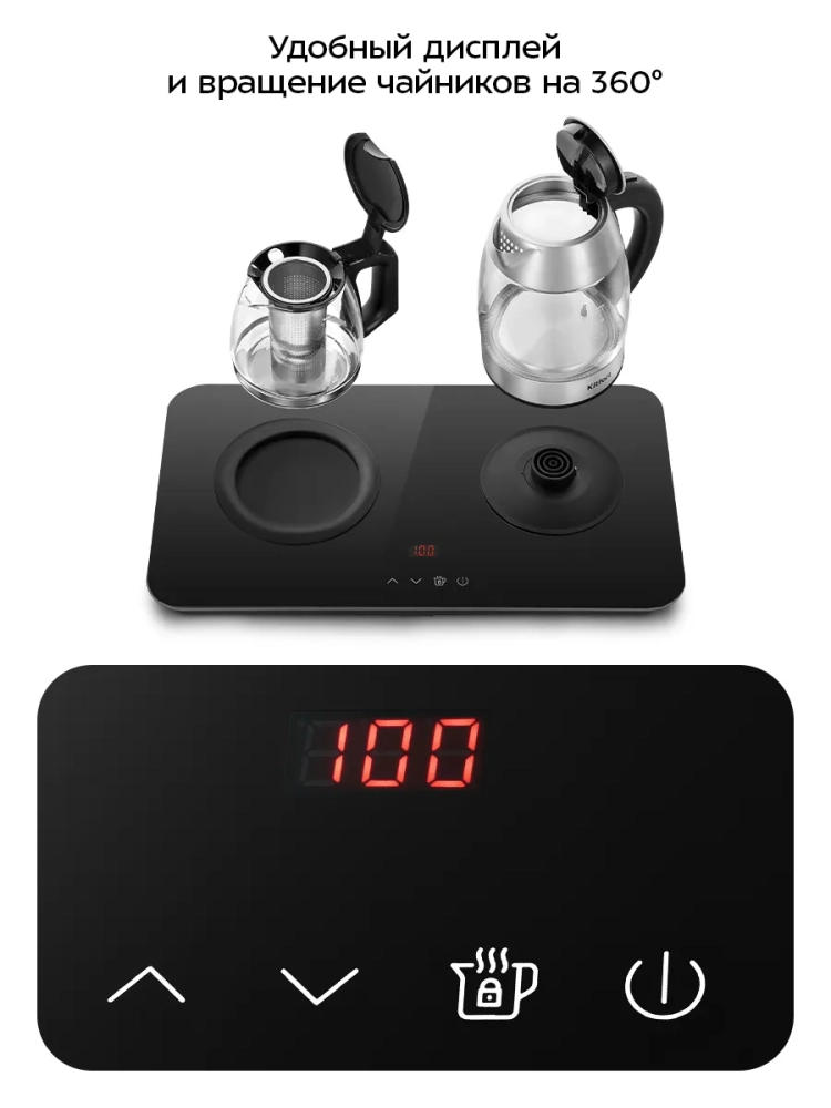 Чайник оснащен центральным контактом, позволяющим устанавливать его на базу в любом положении с возможностью вращения на 360°. Это делает использование техники максимально удобным. Защита от перегрева и включения без воды обеспечивает дополнительную безопасность. Полный чайник закипает всего за 6 минут, что экономит ваше время.