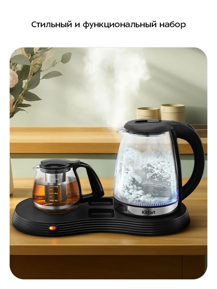 Чайный набор Kitfort КТ-6689 — это превосходное решение для вашего дома, сочетающее стиль и функциональность. В комплект входит стеклянный чайник объемом 1,8 литра и заварочный чайник с фильтром емкостью 0,75 литра. Этот бытовой прибор не только вскипятит воду, но и поможет заварить ваш любимый чай или кофе. Корпус основного чайника выполнен из стекла с пластиковой вставкой, а крышка сочетает в себе нержавеющую сталь и пластик для долговечности. Мерная шкала на боковой стороне корпуса позволяет легко контролировать уровень воды. Пластиковая ручка обеспечивает удобство использования без риска ожогов благодаря своей термостойкости. Внутренняя часть корпуса изготовлена из металла и стекла, что способствует равномерному нагреву воды. Нагревательный элемент температуры скрыт под металлической пластиной из нержавеющей стали, предотвращающей образование накипи и снижая шум при кипячении. Чайник оснащен функцией автоотключения для безопасности использования: он автоматически отключается при перегреве или отсутствии воды. Центральный контакт базы позволяет вращать чайник на 360°, обеспечивая удобство установки в любом положении. Заварник выполнен из термостойкого стекла со съемным фильтром для чая или кофе. База устройства также изготовлена из прочного пластика с кнопкой включения функции поддержания тепла заварочного чайника. Компактное размещение обоих элементов набора делает его идеальным решением для любой кухни. Электропитание осуществляется от сети напряжением ~220–240 В при частоте 50/60 Гц, а мощность составляет 1500 Вт. Длина шнура — 0,8 м; размеры устройства: 430 х 225 x 260 мм.