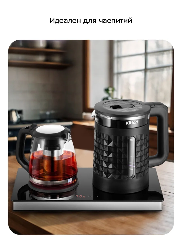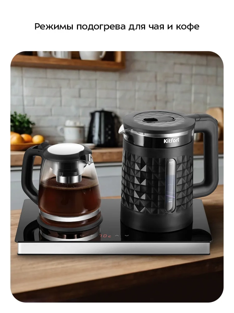 Чайный набор Kitfort КТ-6735 состоит из чайника емкостью 1,7 л, заварочного чайника емкостью 1,2 л с фильтром и базы. Чайный набор позволяет не только вскипятить воду, но и заварить чай или кофе в заварочном чайнике, а также сохранить готовый напиток теплым за счет встроенной платформы с подогревом.