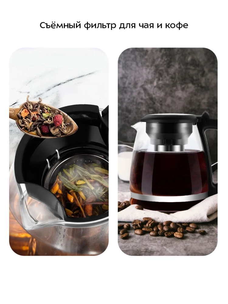 Заварочный чайник изготовлен из термостойкого стекла и имеет съемный фильтр из нержавеющей стали для чая или кофе. В месте установки заварочного чайника на базе находится платформа с подогревом, благодаря которой можно сохранять готовый напиток теплым.
