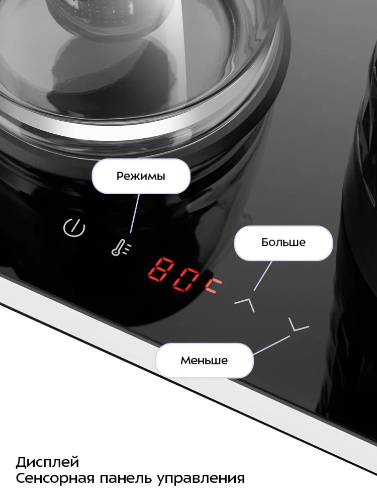 В данной модели предусмотрено два режима работы платформы с подогревом: режим «Чай» и режим «Кофе». На базе расположена панель управления с сенсорными кнопками для выбора режима работы и установки температуры нагрева. В режиме «Чай» можно установить температуру платформы с подогревом от 75 до 85 °С (по умолчанию выбрано 80 °С), в режиме «Кофе» — от 60 до 80 °С (по умолчанию выбрано 70 °С).