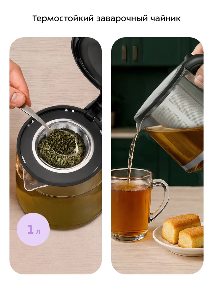 Чайный набор Kitfort КТ-6741 состоит из чайника емкостью 1,7 л, заварочного чайника емкостью 1 л с фильтром и базы. Чайный набор позволяет не только вскипятить воду, но и заварить чай или кофе в заварочном чайнике, а также сохранить готовый напиток теплым в течение 4 часов за счет встроенной платформы с подогревом.