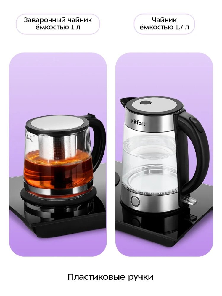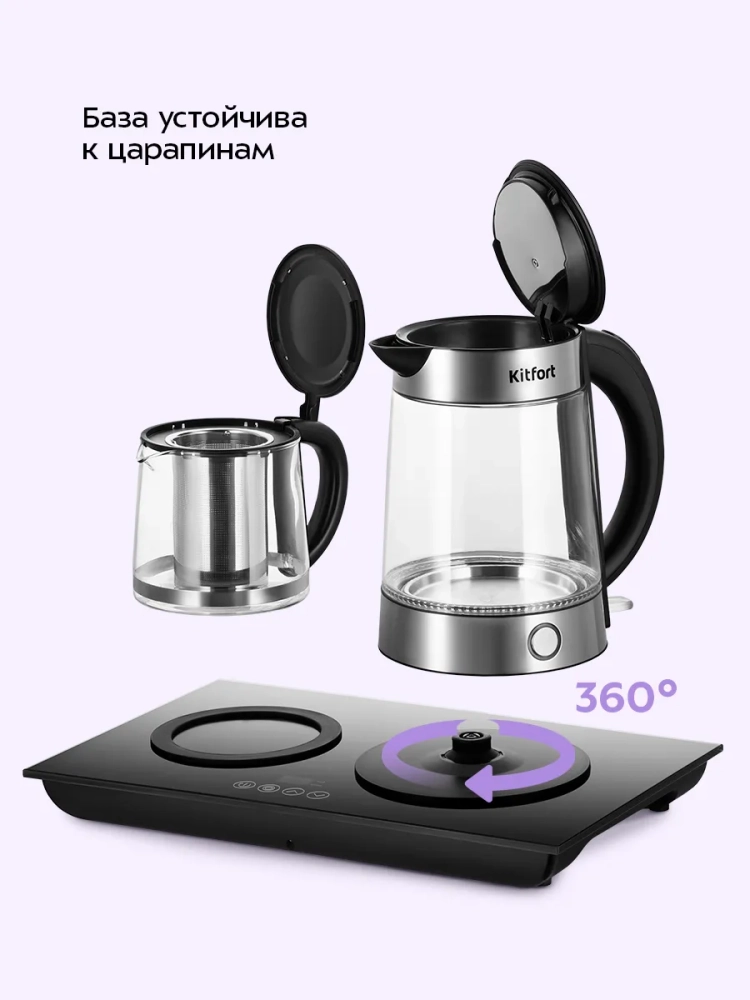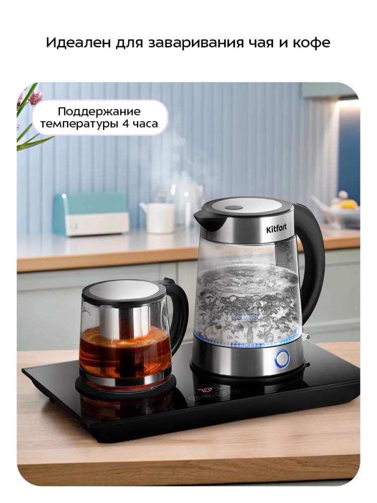 Чайный набор Kitfort КТ-6746 состоит из чайника емкостью 1,7 л, заварочного чайника емкостью 1 л с фильтром и базы. Чайный набор позволяет не только вскипятить воду, но и заварить чай или кофе в заварочном чайнике, а также сохранить готовый напиток теплым в течение 4 часов за счет встроенной платформы с подогревом.