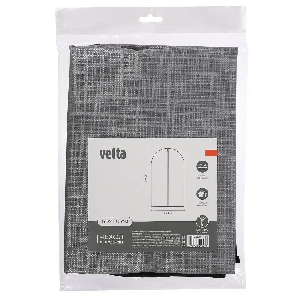 Чехол для хранения одежды VETTA «Джойс» — идеальное решение для тех, кто хочет сохранить свою одежду в идеальном состоянии и защитить её от пыли, грязи и выцветания. Размер чехла составляет 110x60 см, что позволяет хранить в нём практически любую одежду, включая куртки, пальто, платья и костюмы. Изготовлен из высококачественного полипропилена, который обладает рядом преимуществ: он прочный, долговечный, не пропускает влагу и не впитывает запахи. Благодаря этим свойствам чехол VETTA «Джойс» прослужит вам долгое время и сохранит вашу одежду в отличном состоянии. Серый цвет чехла выглядит стильно и современно, он легко впишется в любой интерьер и будет гармонировать с другими предметами. Молния на чехле обеспечивает удобство при использовании и позволяет быстро и легко достать нужную вещь.