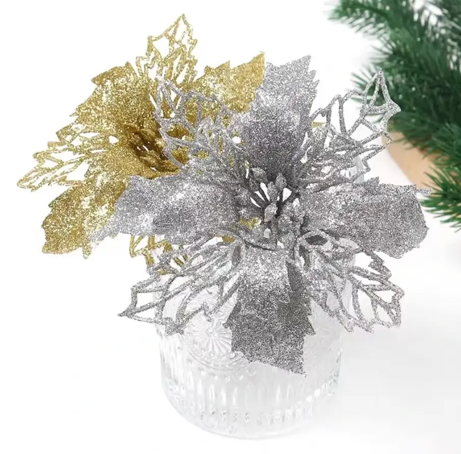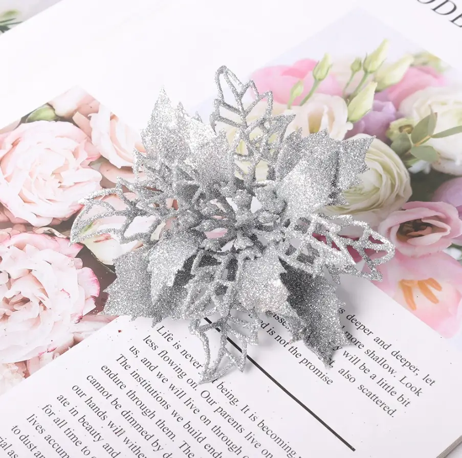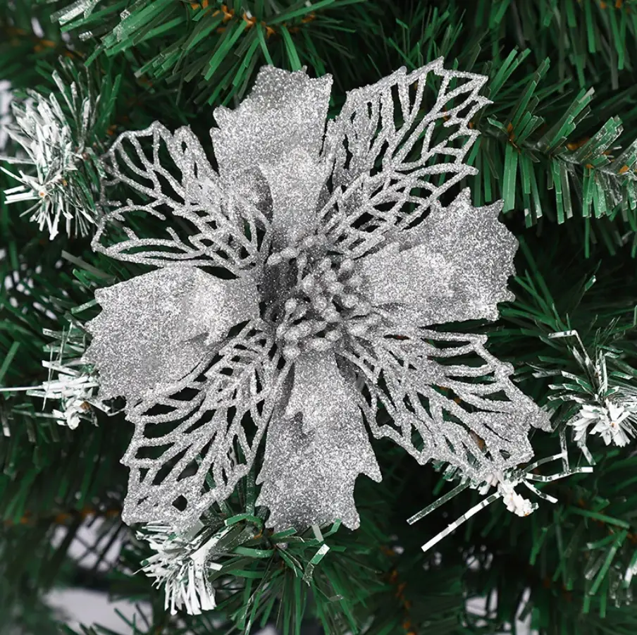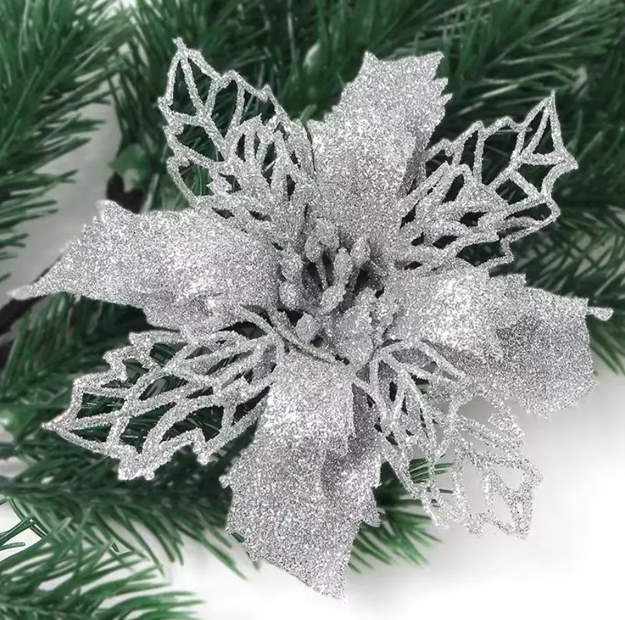 Цветок на елку новогодний Пуансеттия серебристые 3 штуки