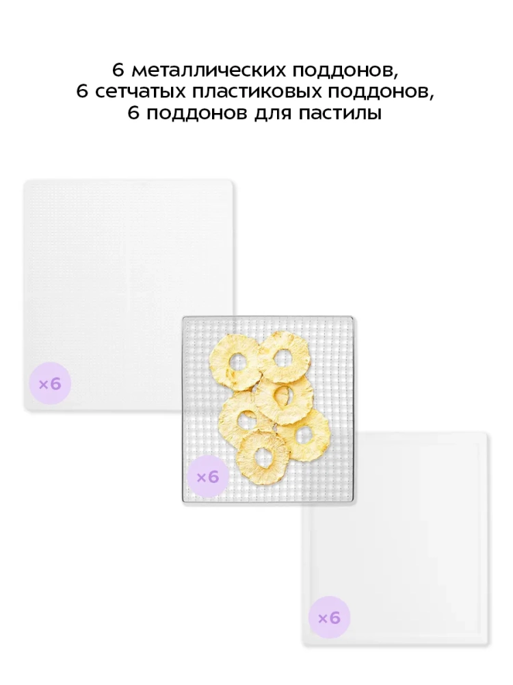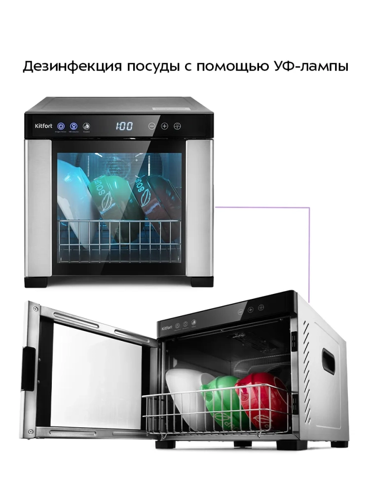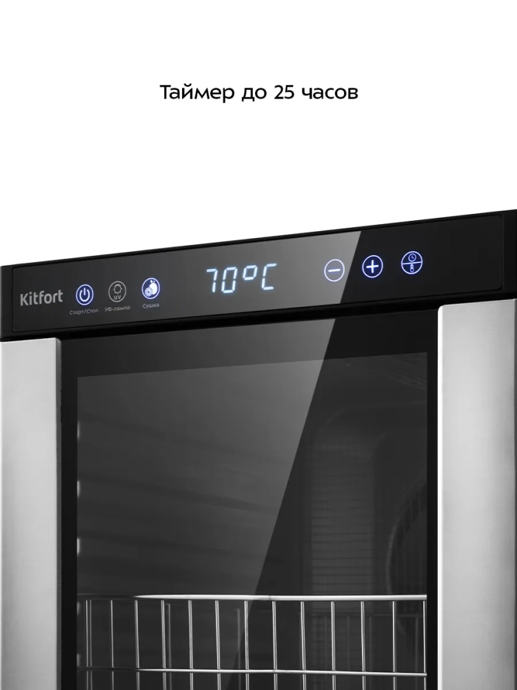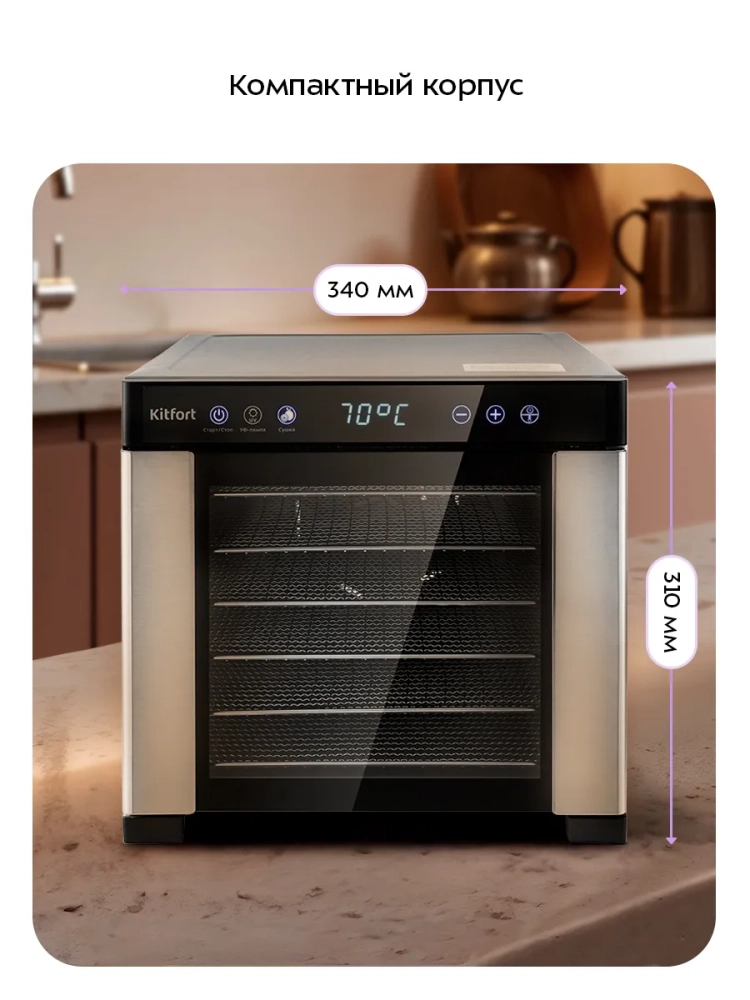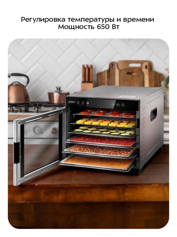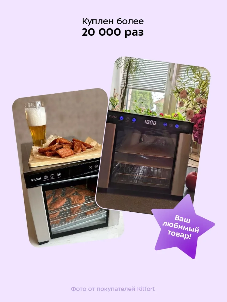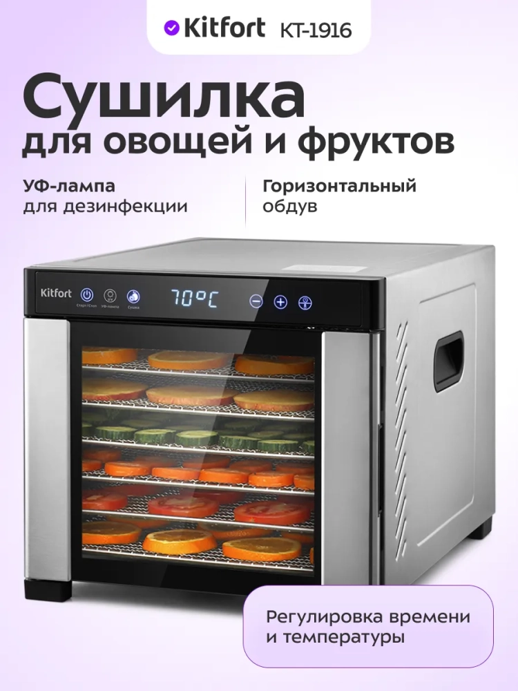 Электрическая сушилка Kitfort КТ-1916 — это многофункциональный бытовой прибор, который станет незаменимым помощником на вашей кухне. Она предназначена для сушки овощей, фруктов, ягод и грибов, а также корнеплодов, трав и зелени. С помощью этой электросушилки можно также обрабатывать мясо, рыбу и хлеб. Особенностью модели является возможность приготовления пастилы благодаря специальным сплошным поддонам. Сушилка оснащена ультрафиолетовой лампой для дезинфекции посуды. В комплекте предусмотрена корзина для посуды, что позволяет одновременно сушить и обеззараживать её. Это особенно важно в домах с маленькими детьми. Kitfort КТ-1916 включает 6 металлических поддонов и 6 сетчатых пластиковых поддонов для удобства размещения продуктов разного типа. Также в комплект входят 6 сплошных пластиковых поддонов специально для пастилы. Температура сушки регулируется от 35 до 75 градусов Цельсия с шагом в 5 градусов, что позволяет точно настроить процесс дегидрации в зависимости от типа продукта — будь то овощ или фрукт. Таймер работы кухонного электро-прибора рассчитан на срок до 24 часов с шагом в полчаса. Эта овощесушилка не только экономит место на кухне благодаря своей многофункциональности: она может использоваться круглый год без необходимости убирать её после сезона урожая. Сетка из комплекта обеспечивает равномерное распределение воздуха внутри устройства во время процесса дегидрации продуктов питания.