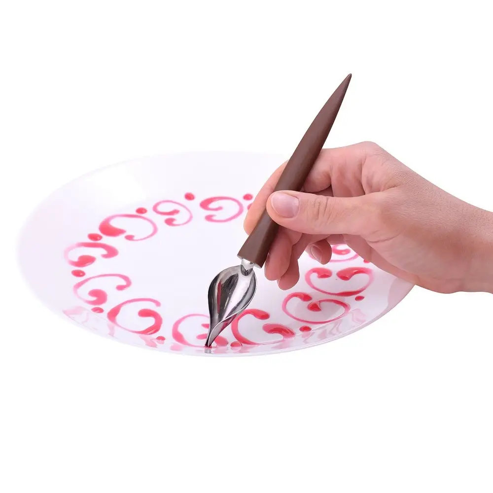 Декоратор-перо поможет красиво оформить кондитерские изделия и украсить блюда. С его помощью можно нарисовать плавные и зигзагообразные линии, капли, перетекающие одна в другую и другие элементы декора. Для рисования подойдут различные соусы, шоколадные и фруктовые сиропы. Декоратор-перо может стать приятным подарком для любителей красиво оформлять блюда. С помощью этого декоратора вы сможете украсить не только блюда, но и тарелки, на которых они будут поданы к столу. После применения рекомендуется мыть мягкой щеткой с жидкими моющими средствами. Хранить в сухом месте. Изготовлено: рабочая часть из коррозионностойкой (нержавеющей) стали, ручка из пластмассы (полипропилен).
