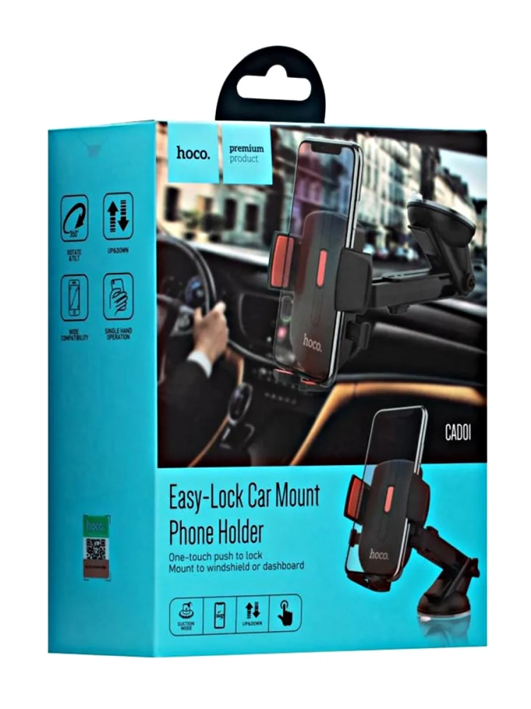 Держатель автомобильный HOCO CAD01 изготовлен из качественного, прочного пластика с элементами из силикона. Крепится на панель приборов автомобиля, боковое или лобовое стекло с помощью вакуумной присоски. Платформа держателя соединена с основанием с помощью шаровой головки, благодаря которой смартфон можно вращать на 360°. Кроме этого, здесь имеется поворотная штанга, которая может поднимать или опускать гаджет, а также изменять расстояние между вами и смартфоном.