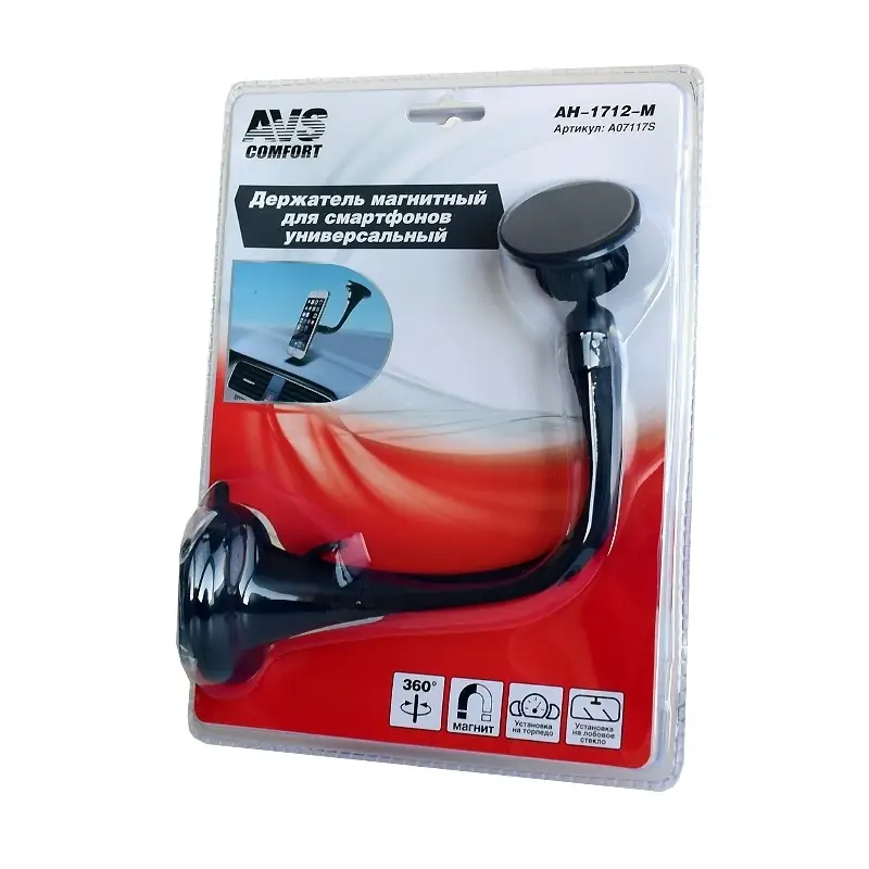 Автомобильный держатель AVS для мобильных устройств обеспечивает надежное крепление и при этом позволяет легко регулировать положение вашего телефона. Легко и надёжно крепится к лобовому стеклу или приборной панели, при помощи вакуумной присоски.