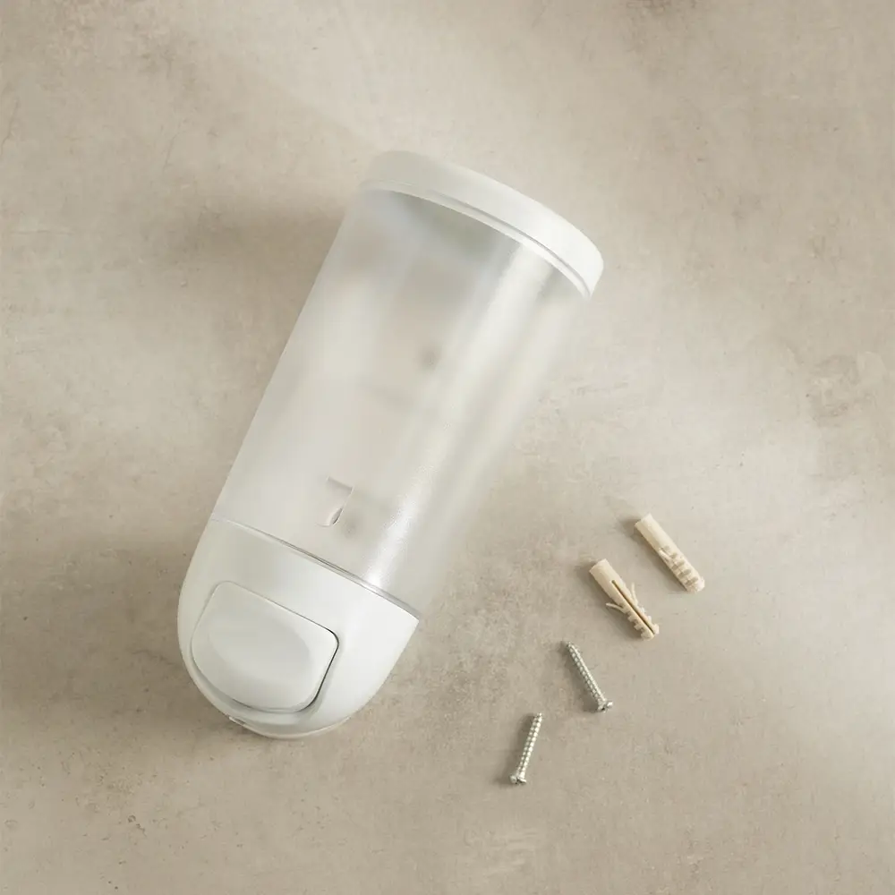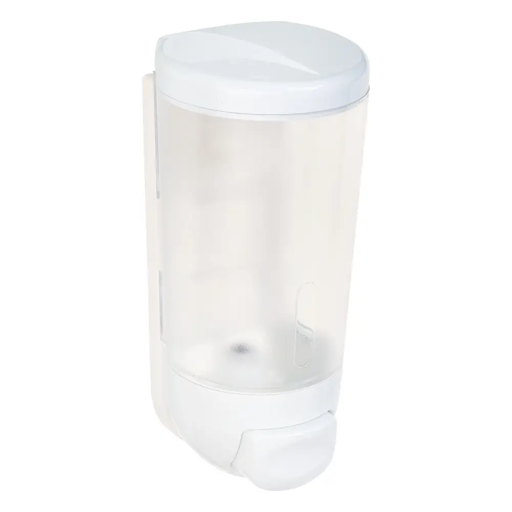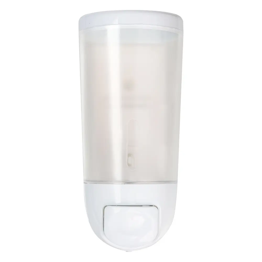 Настенный пластиковый дозатор для жидкого мыла объемом 400 мл предназначен для удобной подачи жидких моющих средств: мыла, геля для душа или шампуня. Полупрозрачный резервуар позволяет контролировать степень наполненности емкости. Мыло выдается путем нажатия на кнопку в нижней части корпуса. Дозатор плотно крепится к стене. Крепеж входит в комплектацию. Подходит как для дома, так и для мест общественного пользования.