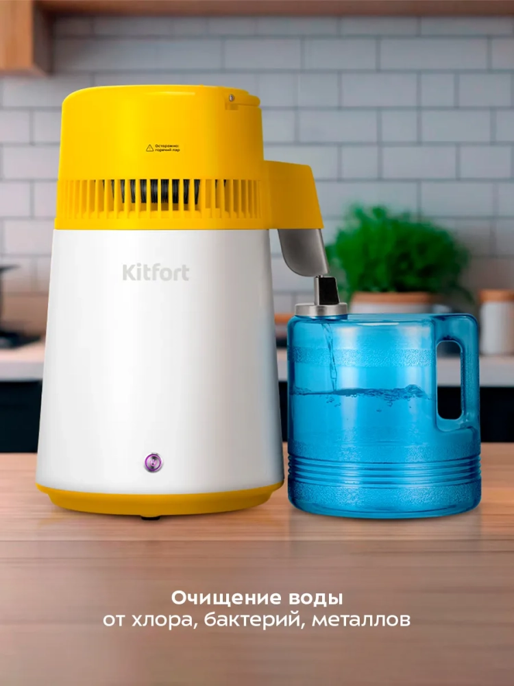 Дистиллятор Kitfort KT-6322 — это устройство для дистилляции воды в домашних условиях. Прибор очищает воду от хлора, различных бактерий, металлов и других вредных для организма примесей.