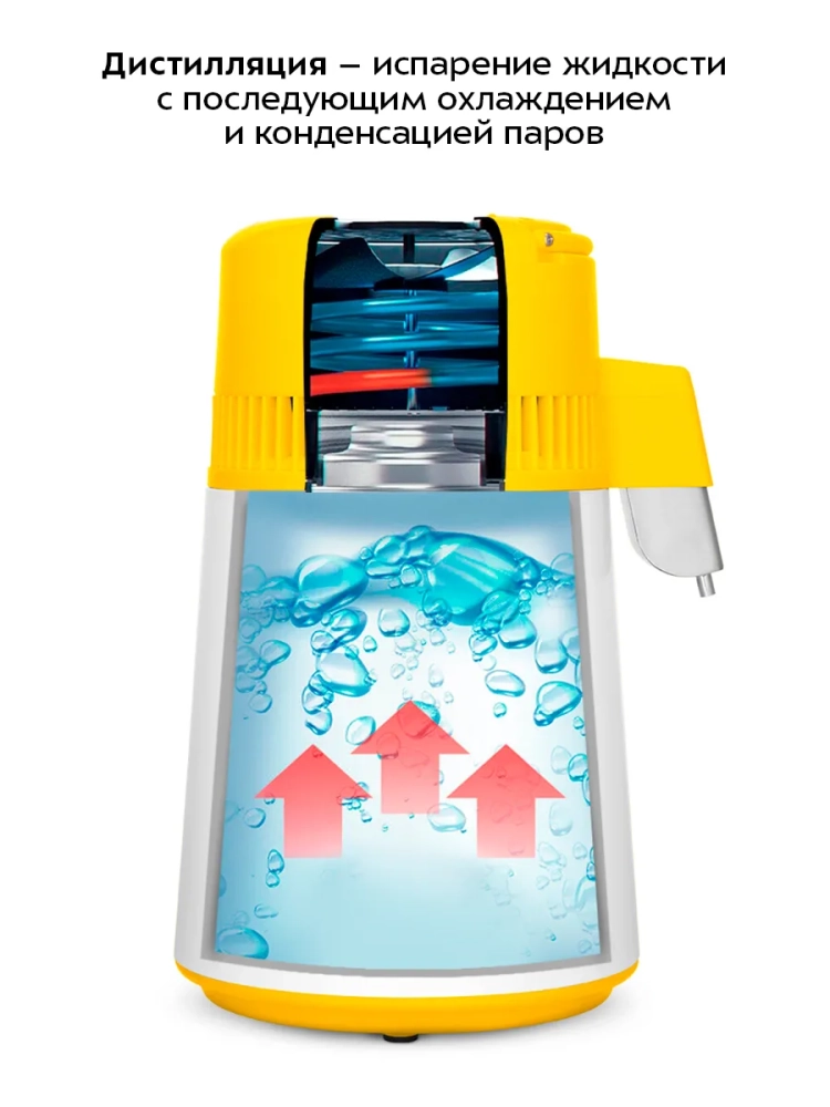 Дистилляция — это испарение жидкости с последующим охлаждением и конденсацией паров. Проще говоря, вода нагревается в бойлере и испаряется, при этом в бойлере остаются все растворенные в воде соли и минералы. Когда пар попадает в змеевик в крышке, он охлаждается вентилятором и конденсируется, затем полученный конденсат (дистиллированная вода) стекает в канистру.