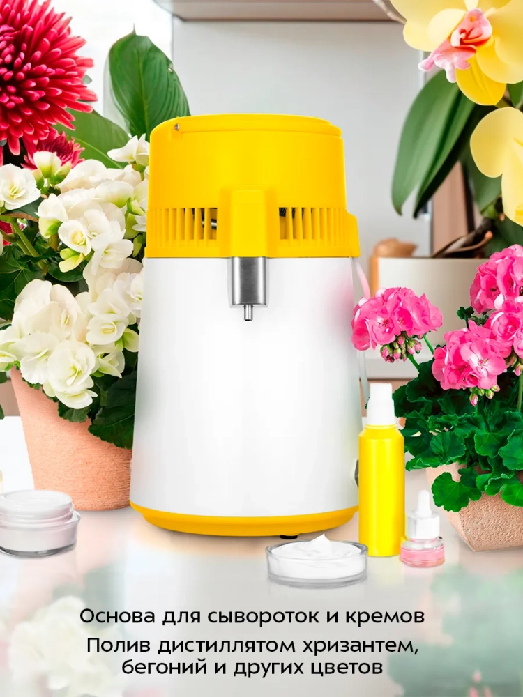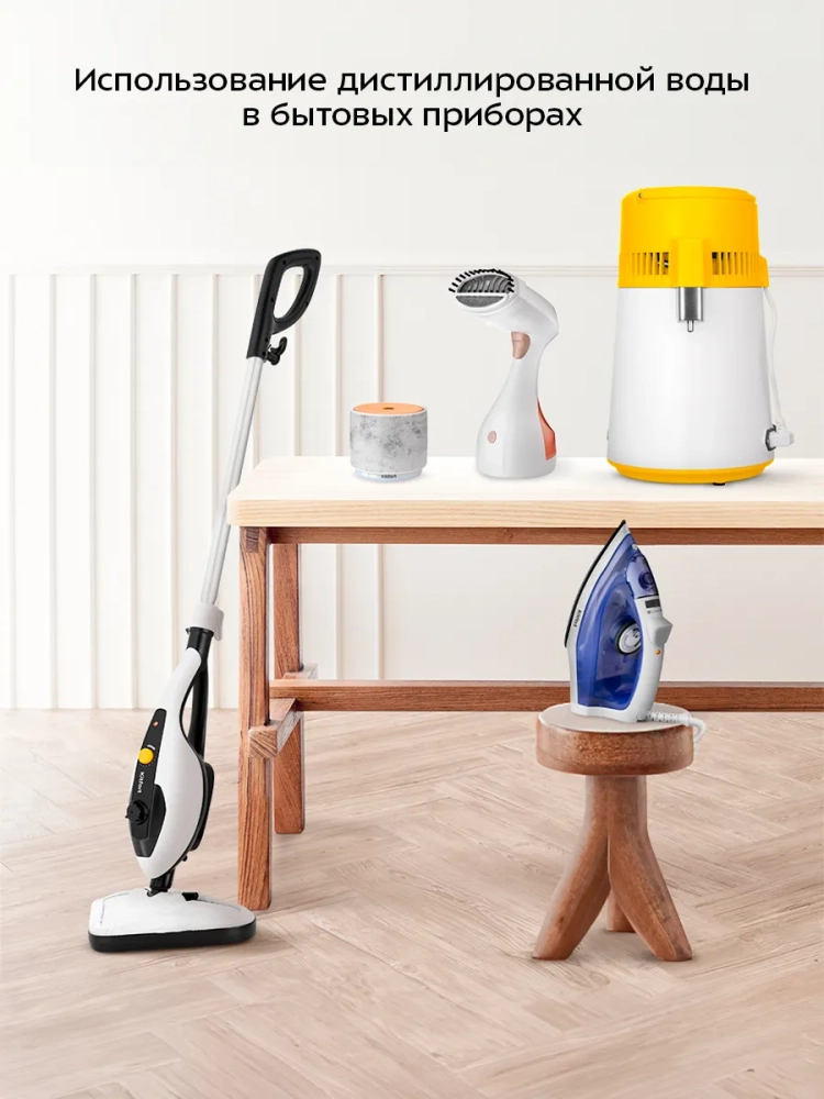 Дистиллированная вода очень полезна в быту. Ее можно заливать в утюги, отпариватели, увлажнители воздуха, паровые швабры и прочие бытовые приборы, тем самым обезопасив их от появления накипи. В косметологии рекомендуется использовать дистиллированную воду в качестве основы для сывороток и кремов, т.к. дистиллированная вода усиливает эффект от их применения. Некоторые растения, такие как бегонии, хризантемы, пеларгонии, цикламены и орхидеи рекомендуется поливать дистиллятом. Если у вас есть автомобиль, то дистиллированной водой можно разбавлять антифриз, который уже находится в системе автомобиля, так как вода, содержащаяся в антифризе, со временем испаряется. Дистиллированную воду можно использовать в качестве стеклоомывающей жидкости: если заливать в бачок для стеклоомывающей жидкости простую воду из-под крана или бутилированную воду, то на стеклах будет оставаться белый осадок растворенных в воде солей. От дистиллята пятен и разводов на стеклах не будет. Также дистиллированной водой можно разбавлять омыватели-концентраты, как зимние, так и летние.