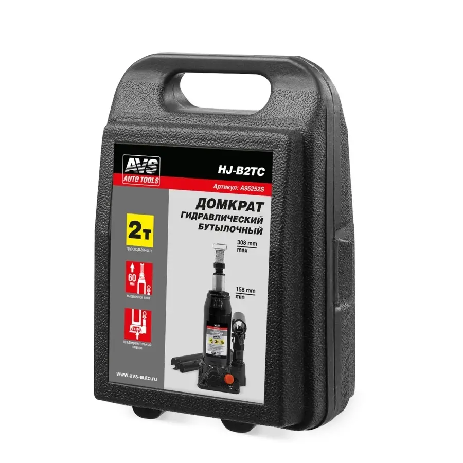 Домкрат гидравлический AVS HJ-B2TC, 2т, 158-308мм с клапаном, в кейсе (ремкомплект)