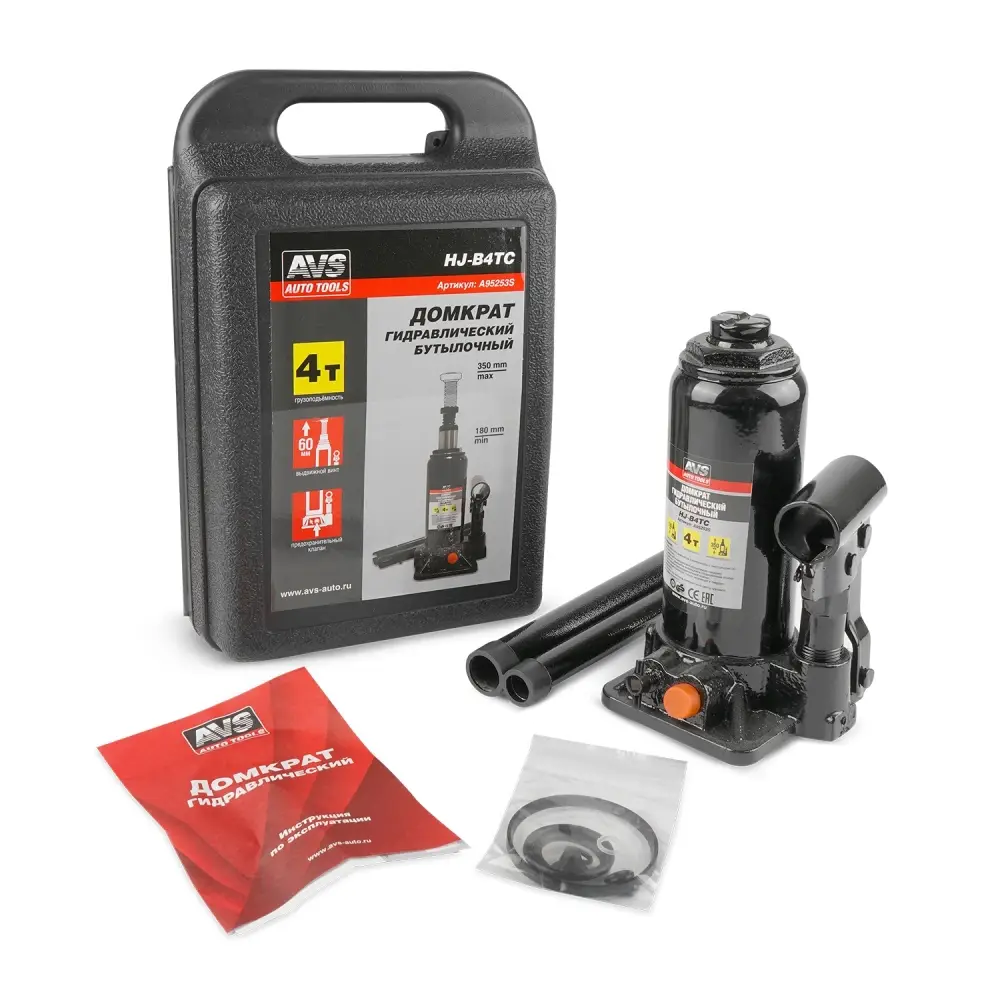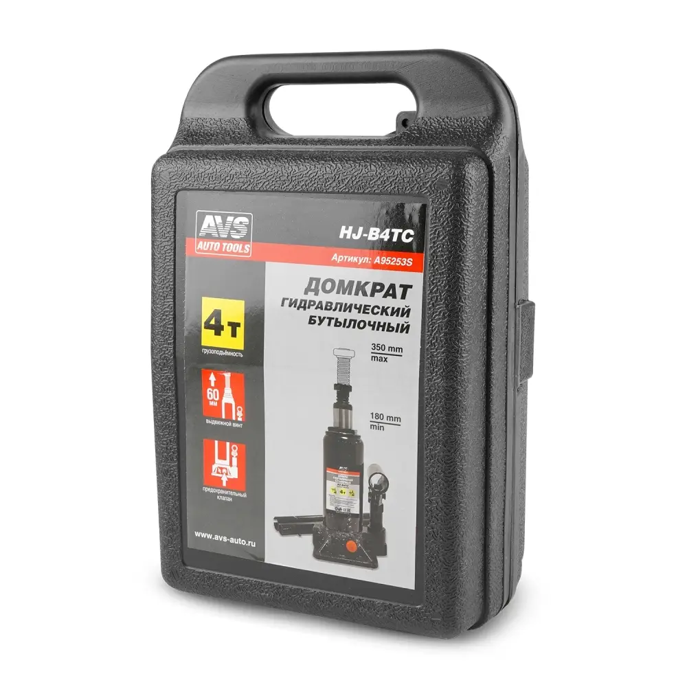Домкрат гидравлический AVS HJ-B4TC, 4т, 180-350мм. с клапаном, в кейсе (ремкомплект)