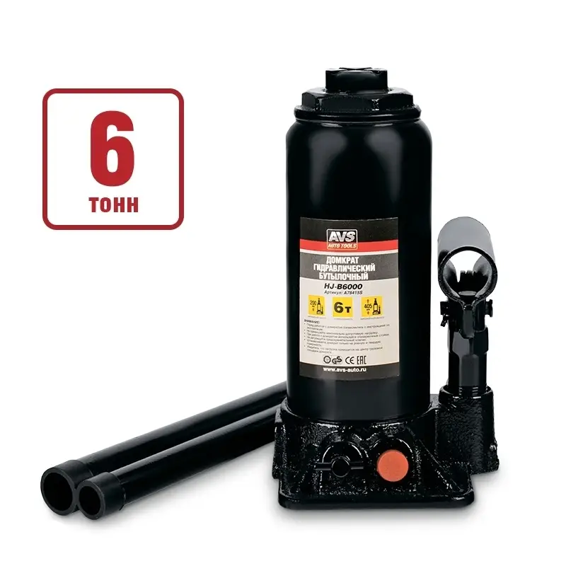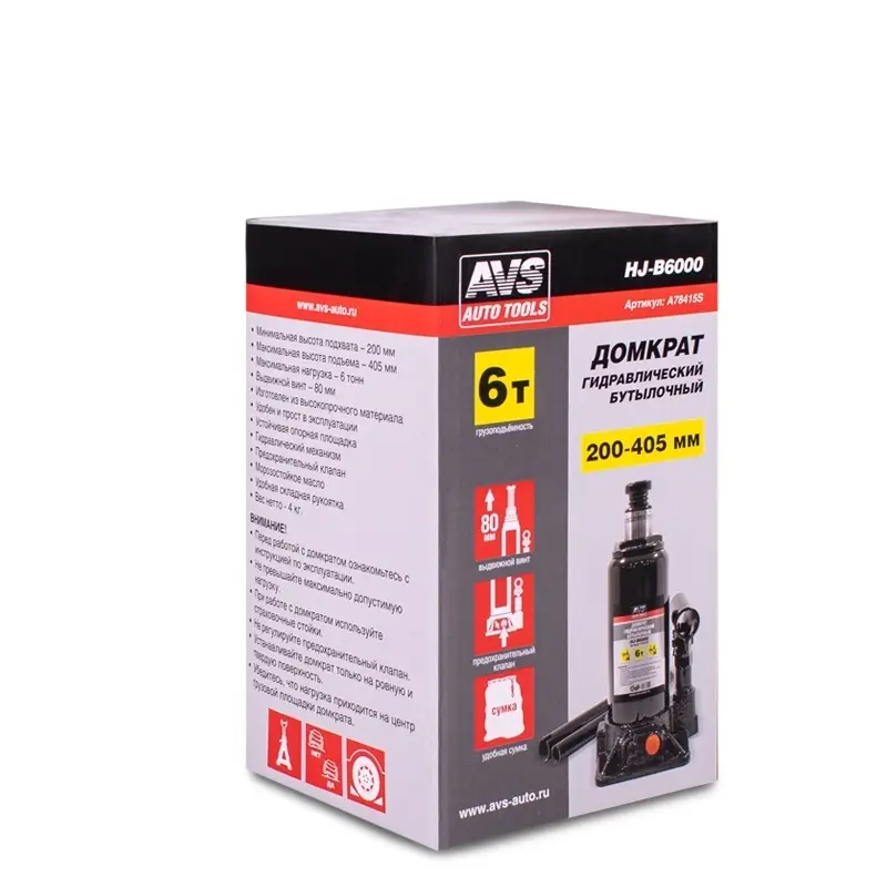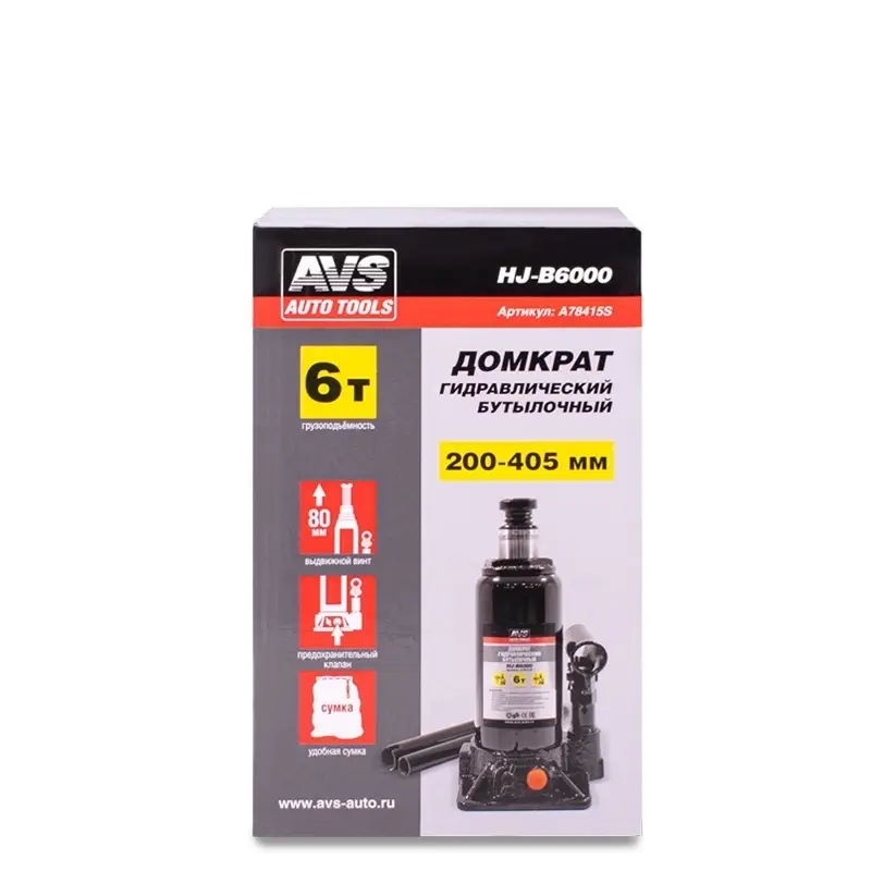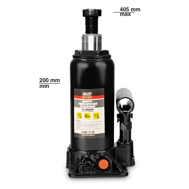 Домкрат гидравлический AVS HJ-B6000, 6т, 200-405мм. с клапаном (сумка, ремкомплект)