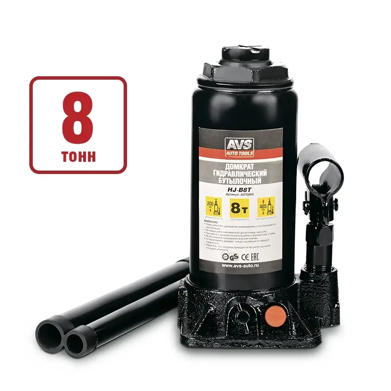 Домкрат гидравлический AVS HJ-B8T, 8т, 200-405мм. с клапаном (сумка, ремкомплект)