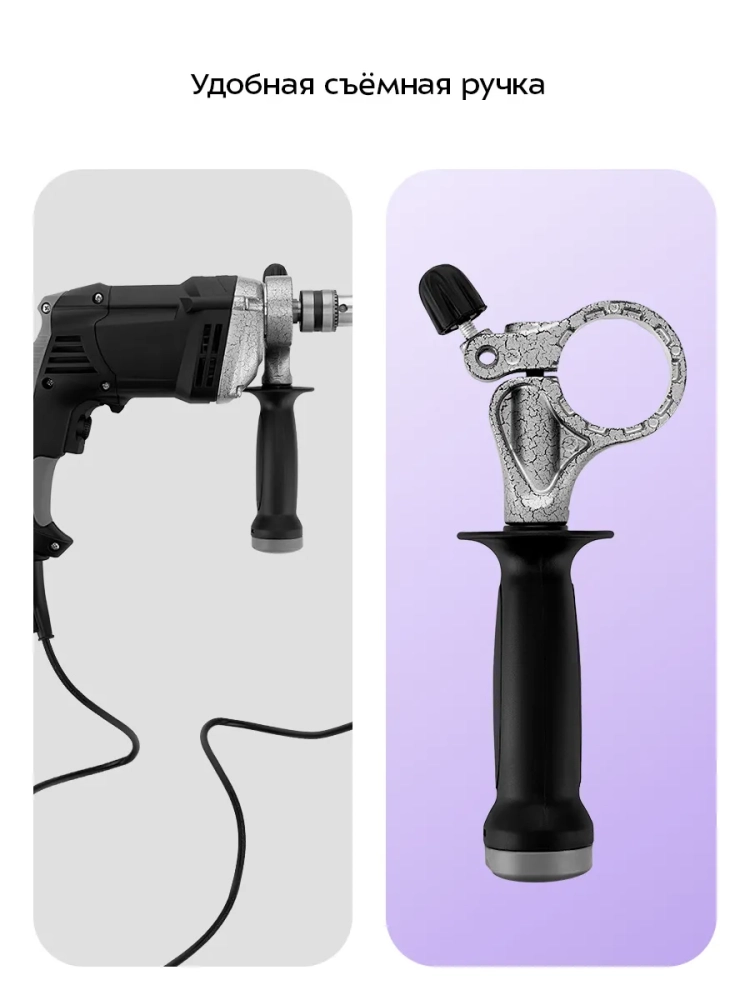 Дрель КТ-6532 удобно лежит в руках благодаря съемной боковой ручке, расположение которой можно менять; также вы можете ее снять. Устройство оснащено регулятором скорости вращения. Чем скорость больше, тем более твердые материалы можно сверлить.
