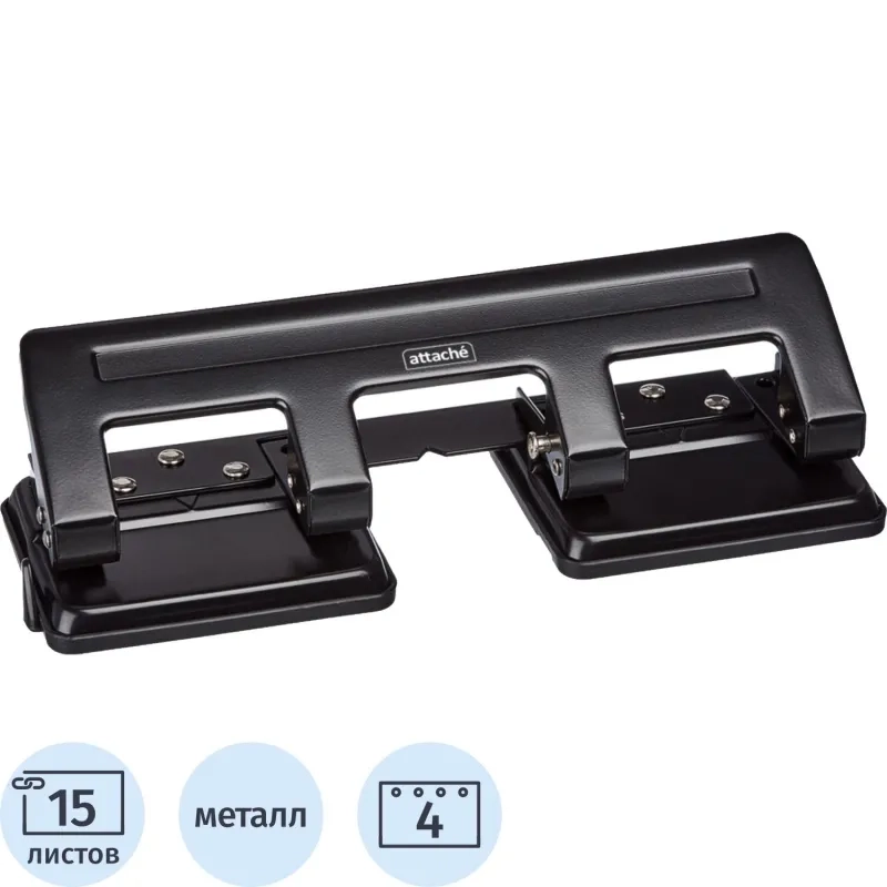 Дырокол Attache на 4 отверстия, до 15 листов, металл, черный