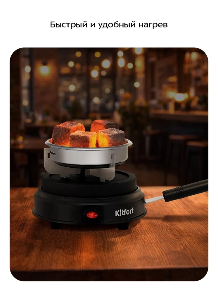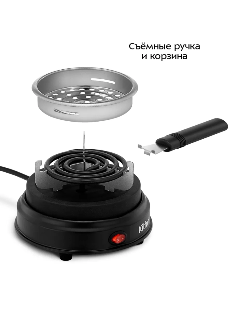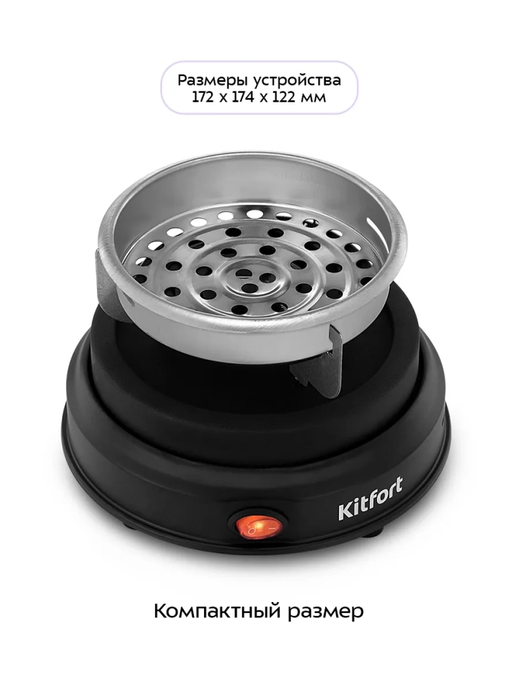 Электрическая плита для розжига углей для кальяна Kitfort КТ-5424 поможет быстро и удобно разогреть угли для кальяна. Электрическая плита для розжига углей убережет вашу кухонную плиту от повреждений и загрязнения пеплом. Время разогрева углей составляет 3–5 минут. Угли укладываются в специальную корзину для углей.