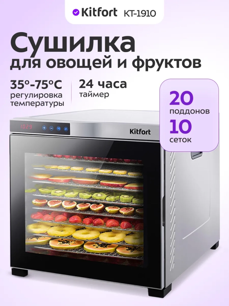Электрическая сушилка Kitfort КТ-1910 — это идеальное решение для тех, кто хочет сохранить свежесть и вкус своих продуктов. Эта мощная электросушилка предназначена для сушки овощей, фруктов, ягод, грибов, мяса и других продуктов. С помощью этой сушилки вы сможете легко приготовить пастилу благодаря специальному поддону для жидкости. В комплект входят 10 поддонов из нержавеющей стали и 10 сеток для мелких продуктов, что позволяет одновременно обрабатывать большое количество ингредиентов. Сушилка оснащена мощным нагревательным элементом и вентилятором большого диаметра, который обеспечивает равномерное распределение горячего воздуха по всей камере. Это гарантирует качественную сушку без смешения запахов даже при одновременной обработке различных видов продуктов. Температура сушки регулируется в диапазоне от 35 до 75 градусов Цельсия с шагом в 5 градусов, что позволяет точно настроить процесс под каждый тип продукта. Таймер настраивается до 24 часов работы с шагом в полчаса — это удобно для длительной обработки больших партий овощей или фруктов. Дегидратор Kitfort КТ-1910 станет незаменимым помощником на вашей кухне благодаря своей универсальности и простоте использования. Эта овощесушилка подходит не только для домашних условий: она также может использоваться профессионалами в кулинарии или теми, кто занимается заготовками на продажу. Поддон из нержавеющей стали обеспечивает долговечность устройства даже при интенсивной эксплуатации. Сетка помогает эффективно высушивать мелкие продукты без риска их выпадения через крупные отверстия стандартных поддонов. Электросушилка Kitfort КТ-1910 — это надежный дигидратор как для любителей здорового питания, так и профессионалов.