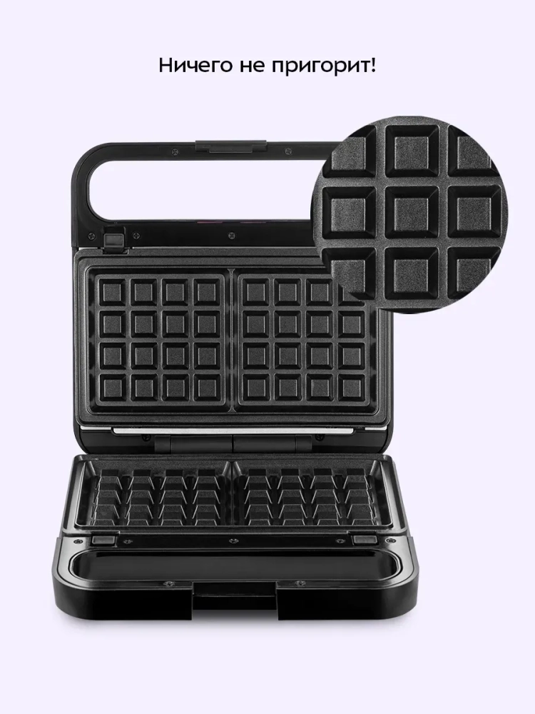 У прибора три пары панелей: панели для приготовления вафель, панели для приготовления бутербродов и ребристые панели для гриля. Высокая температура нагрева панелей способствует быстрому приготовлению продуктов. Для удобства ухода панели сделаны съемными — их можно мыть под проточной водой.