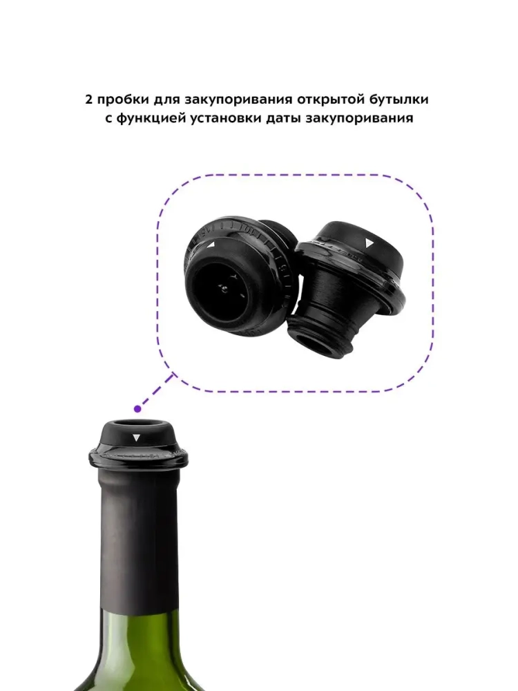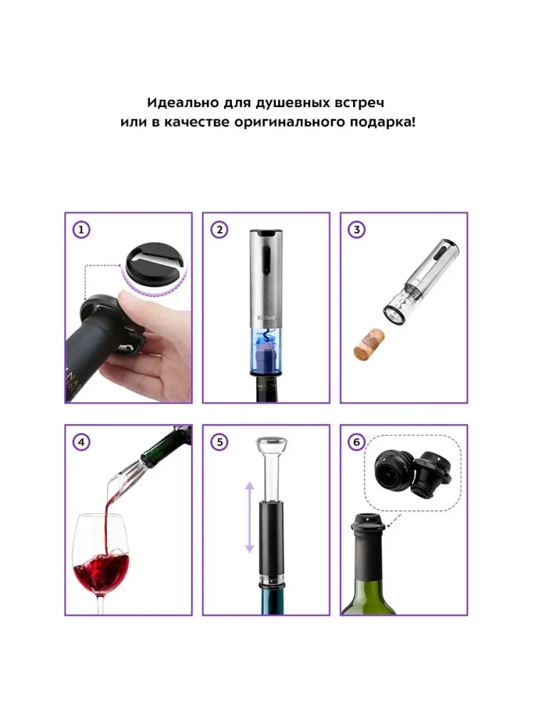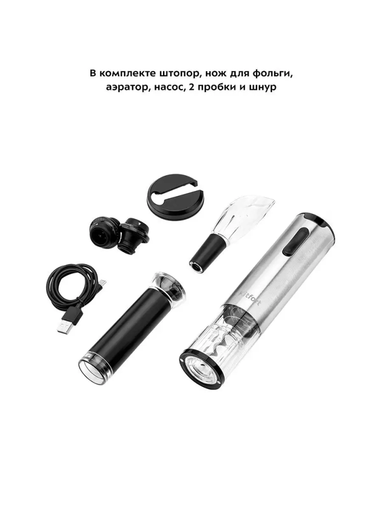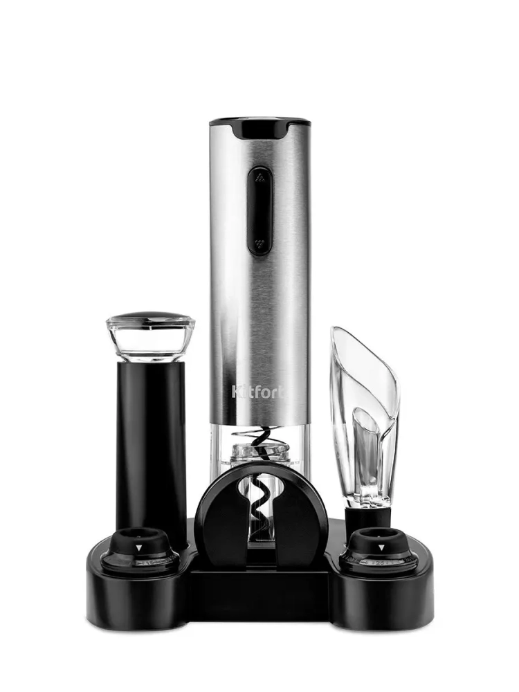 Электрический штопор «3 в 1» Kitfort KT-4041 поможет легко, быстро и безопасно открыть бутылку вина, красиво подать вино к столу, аэрировать и закупорить открытые бутылки вина. В набор входят штопор, нож для фольги, аэратор, насос и 2 пробки, шнур и база для зарядки и хранения штопора и всех аксессуаров. Благодаря электрическому штопору процесс открывания бутылки станет простым и займет всего несколько секунд. Также вам больше не придется прикладывать дополнительные усилия, как это часто бывает при использовании обычного штопора. Электрический штопор предотвращает риск пролить вино или пораниться. С ним вы можете эффектно открыть вино для подачи к столу и удивить гостей. Корпус устройства выполнен из металла и пластика, а спираль полностью скрыта корпусом. Чтобы наблюдать за процессом, нижняя часть корпуса прозрачная. В комплекте есть специальный нож для фольги, чтобы снять верхнюю часть фольги с бутылки и приступить к открыванию пробки. Пользоваться электрическим штопором очень просто, так как у него всего одна кнопка: при нажатии на нижнюю часть кнопки штопор открывает пробку, а при нажатии на верхнюю часть кнопки включается движение в обратном направлении, чтобы удалить пробку из штопора. Во время работы и зарядки штопора включается подсветка. Устройство питается от встроенного аккумулятора. Штопор заряжается при установке на базу для зарядки. Аэратор устанавливается в горлышко бутылки и насыщает напиток кислородом, когда вино наливают в бокал. Насыщение кислородом раскрывает вкус и аромат напитка. Сомелье советуют аэрировать многие сорта вин, однако некоторым сортам аэрация может навредить и испортить вкус. Вы можете ориентироваться на свои вкусовые предпочтения или более подробно изучить рекомендации сомелье в интернете. Пробки и вакуумный насос сохранят вкус и аромат открытого вина.