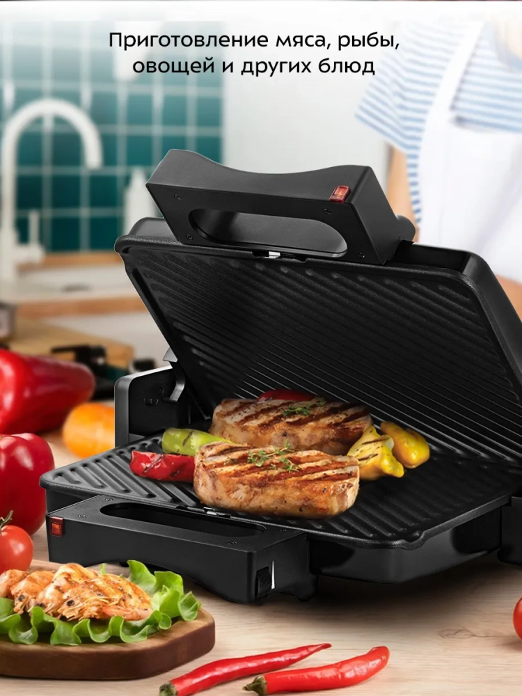 Также из-за особой конструкции крышку гриля можно поднять так, что она будет находиться на расстоянии от нижней панели. Это удобно для приготовления объемных или хрупких продуктов.